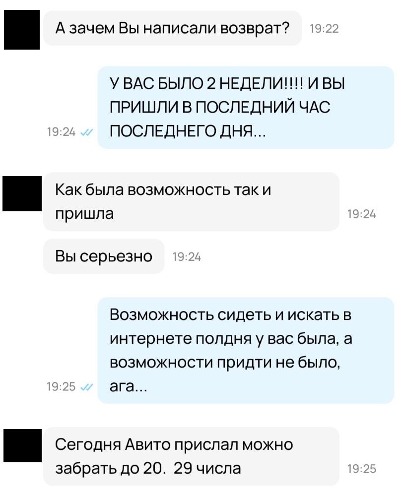 Я буду мониторить их профили на Авито. Если начнут продавать — закажу несколько товаров с разницей в 5 дней и не заберу. Пидорасы блядь.