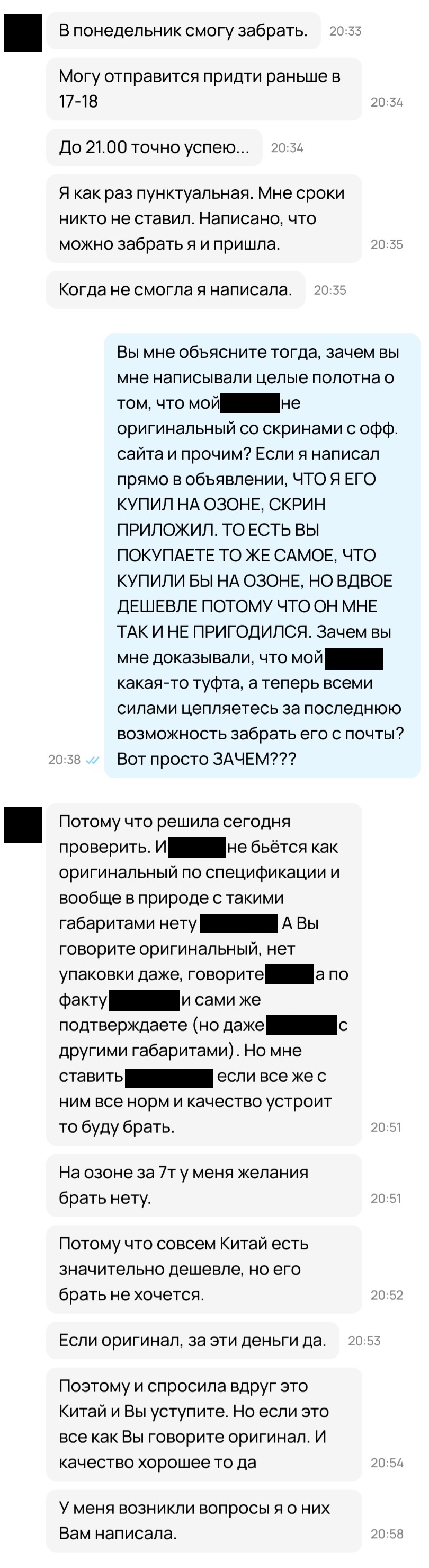 >>803654 >>803658 >>803665 Блять, перечитал и захотелось ей ебальник набить. Самые оскороносные моменты заскринил. Там намного больше, но цензурить лень, да и ничего кроме её нелепых оправданий там нет. На третьем скрине вы видите реакцию пизды, блеф которой не выгорел. Там уже начинает упрашивать возобновить заказ и говорит что в понедельник заберёт, на что получает былинный отказ.