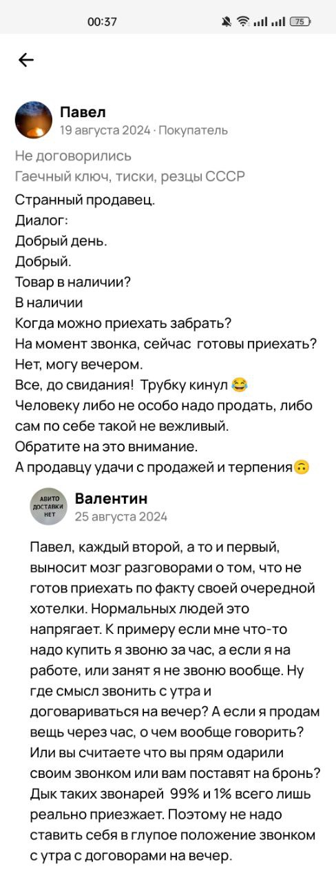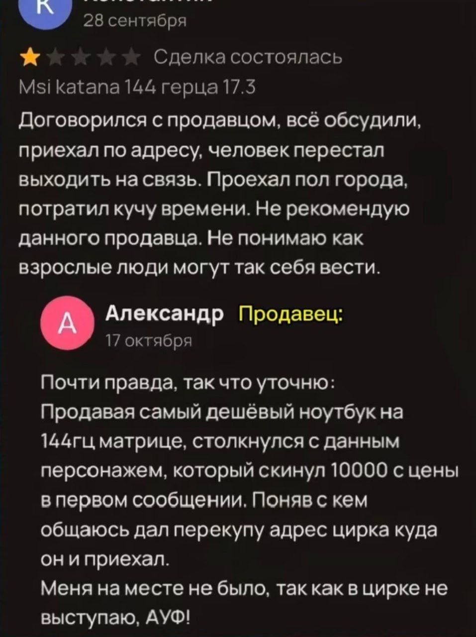 В: Что делать, если покупатель не пришел на встречу/не выходит на связь/игнорит? О: Это база. Привыкай и терпи, если нет мочи терпеть - можно накатать гневный отзыв, но авито может его отклонить по своей прихоти, магазины вообще сами модерируют свои отзывы, ибо кто оплачивает, тот и танцует продаёт.