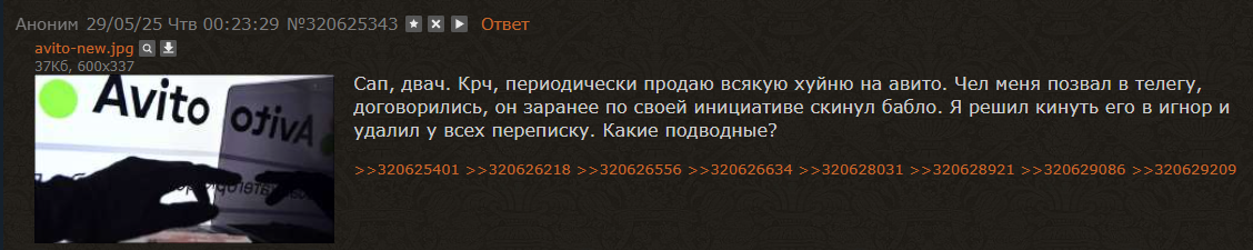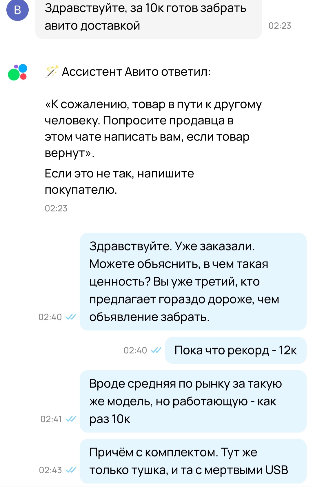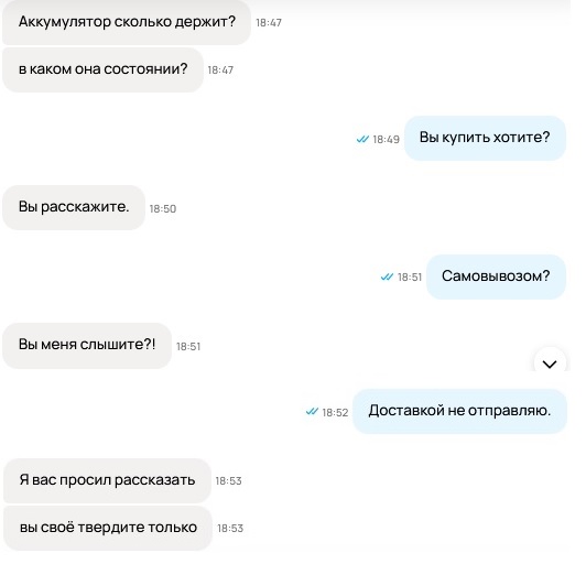 В: На авито приходят сообщения типа "еще продаете" или "отправите доставкой", отвечаю и дальше меня всегда игнорят, как быть? О: Гении из авито сделали кнопки для начала диалога, покупатель случайно их нажимает. Терпи.