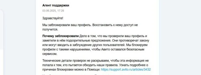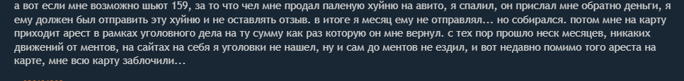 >>803683 У меня такое было. Отправил посылку одному челу, через некоторое написал перекуп, у него бомбануло, упрашивал, чтобы я ее отправку отменил и продал ему. А ему отказал, и он как-то ебнул жалобу. Заблочили и начали требовать паспорт и слепок ануса. Я забил. Тот чел забрал посылку, деньги на аккаунт упали. В сообщении о бане написано, что деньги я могу забрать и перестать пользоваться авито. На деле же саппорт на такие обращения требовал верификацию по биометрии. Ничем не закончилось, аккаунт заблочен, деньги не получил. Похуй.