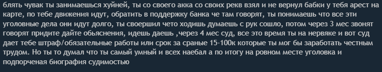 >>805543 Вчера буквально такую схему крутил. Никаких предупреждений в чате не было. Даже номер свой кидал для перевода. Но это дичь ебаная конечно, потому что и покуп сам может упоминать карту сразу. И как тогда быть с заказами, которые не через доставку?