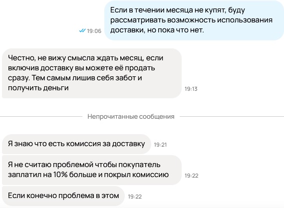 Всегда проигрываю в уме, когда представляю ебальник покупана, который пишет, чтобы подначить тебя на уменьшение цены «А у меня есть возможность взять за такую же цену, но там еще есть Х». А ты вместо того, чтобы скидывать цену жлобу, отвечаешь «Покупайте там».