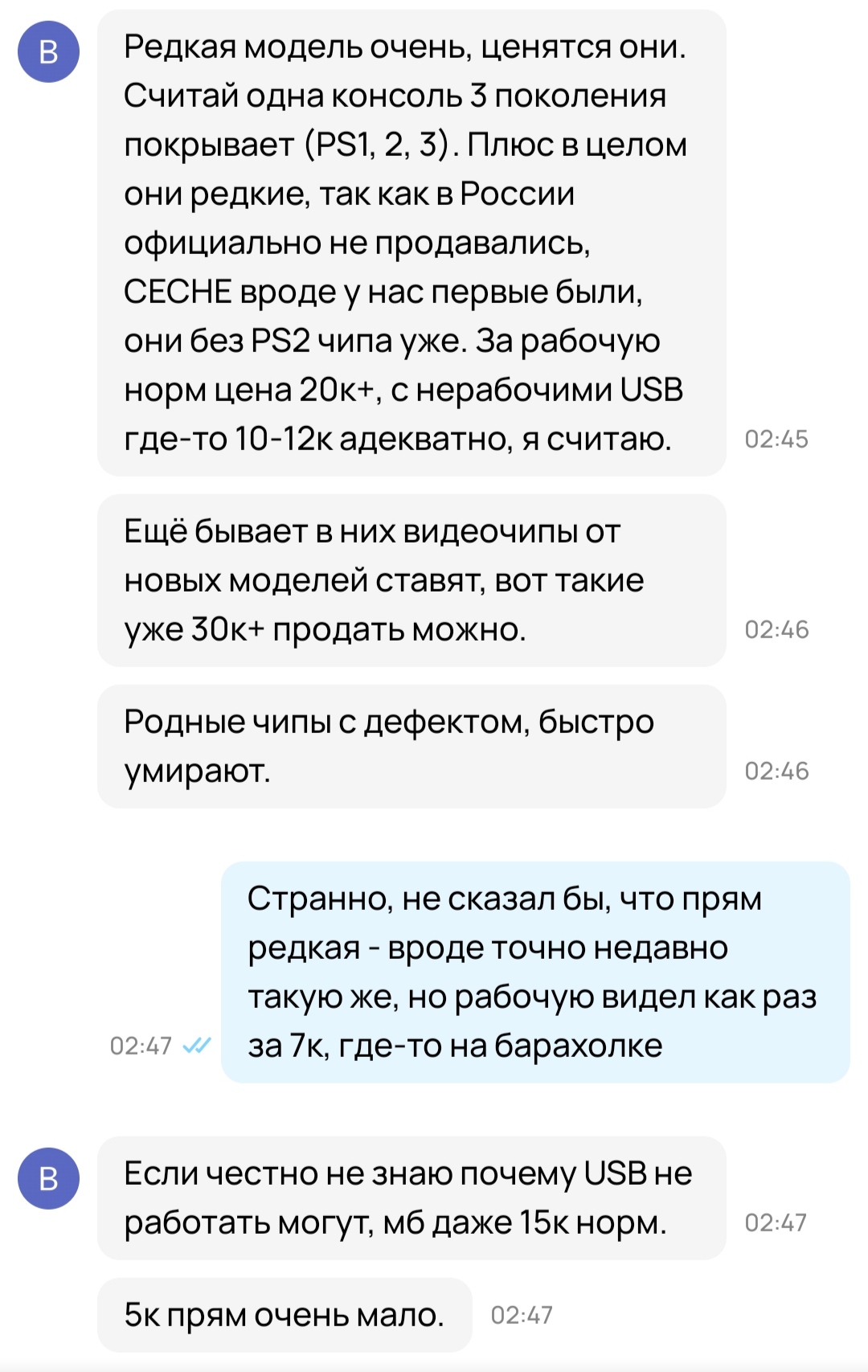 Сап жидач, посвятите, не проебываю ли я святой Грааль за три копейки? Есть третья плойка, фатка, с обратной совместимостью и всем таким. Досталась от знакомого, купил за 1500, не работают юсб, думал починить, но руки не доходят. Выставил на Авито за 3500, указал, что второй владелец, возможно была в ремонте, не работают юсб, картинка есть, запуск есть, внешне в норм состоянии. Тут же написали два чела, один сразу же выкупил, второй предложил 6к вместо трёх, третий предложил 6500. В чём мем? Вроде бы новая плойка стоит в районе 8-10к, нахуя брать нерабочую за 60% цены?