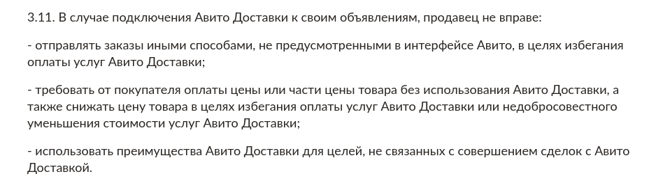 > 3.11. В случае подключения Авито Доставки к своим объявлениям, продавец не вправе:
