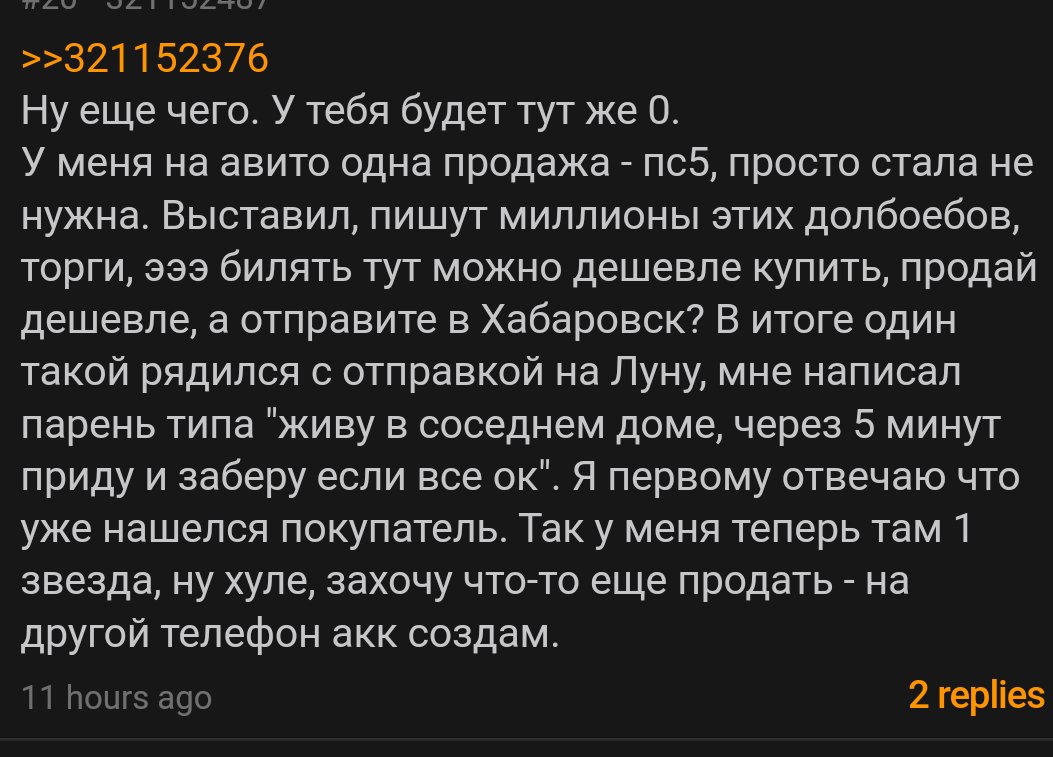 В Казахстане, откуда я родом, вообще кроме OLX нихуя нет, а у него, задумайтесь, еще в разы более тупые юзеры, отсутствует доставка, нулевой спрос из-за небольшого населения и отсутствия у них спроса на нишевые товары, нет отзывов для продавцов (читай «скамь всех с одного аккаунта годами и негде оставить плохой отзыв) также отсутствует доступ ко многим товарам, которые в РФ можно найти только на Авито. Да вы охуели, с жиру беситесь бля! В Казахстане я бы хуй продал монитор и вообще все то, что продал на Авито. Это буквально невозможно.