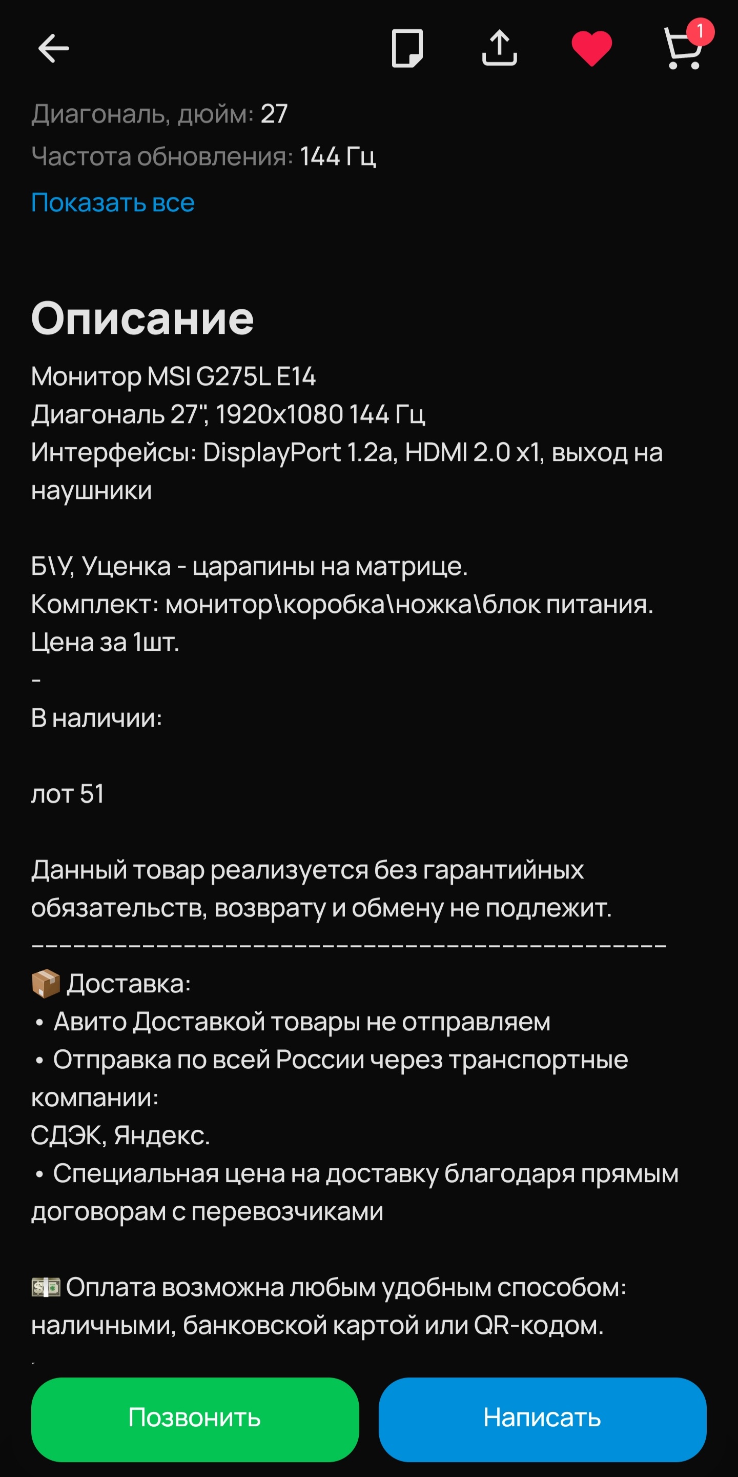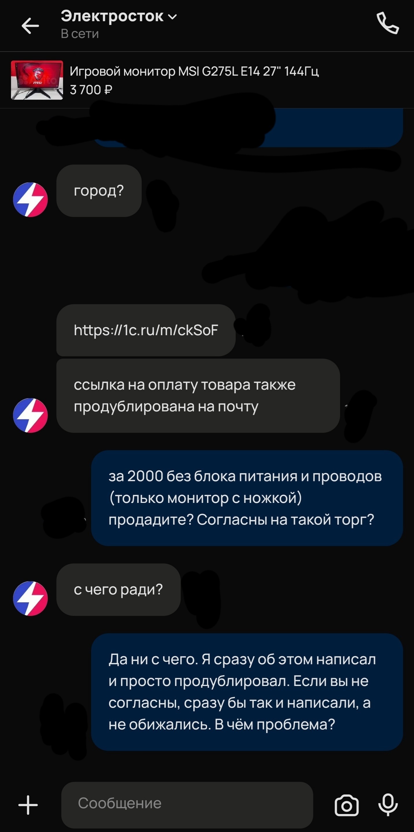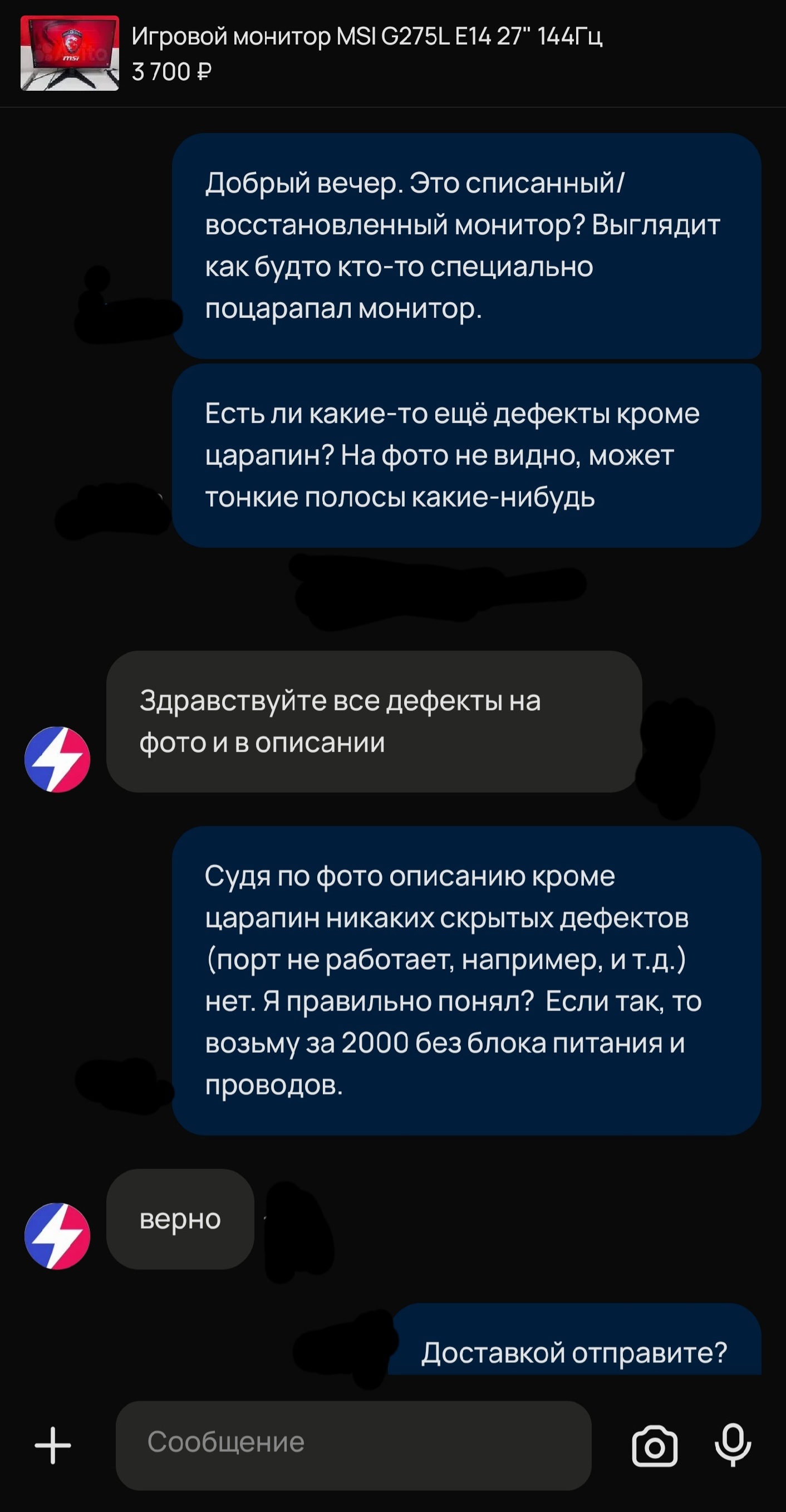 Копросток-продавцы говна, с нереальным чсв и хамством с порога, что уже вызывает отторжение и подозрение, не рекомендую связываться. Ну откажись ты от торга, напиши "нет, не продам" - всё. Нет, кабанчик-дегенерат обязательно нахамит, и в целом покажет что ему тут вообще ничё не надо, лохи итак купят, а ты говно и отвлек его от важных дел своими тупыми вопросами (которые в этой теме весьма актуальны и не тупые, хитрый продаван может умолчать в описании о скрытых дефектах, которые не видны на фото и потом сказать что не было такова, товар ведь негарантийный и вообще пошел ты нах). при всём этом монитор в хорошем состоянии этой же модели стоит 10к максимум, грубо говоря в 2 раза дороже цены монитора в ихнем объявлении, у которого специально поцарапано покрытие, скорее всего это поношенный витринный образец, который гоняли 24/7, а теперь списали, специально поцарапав, и продают. И он может отъебнуть через 3 дня после покупки.