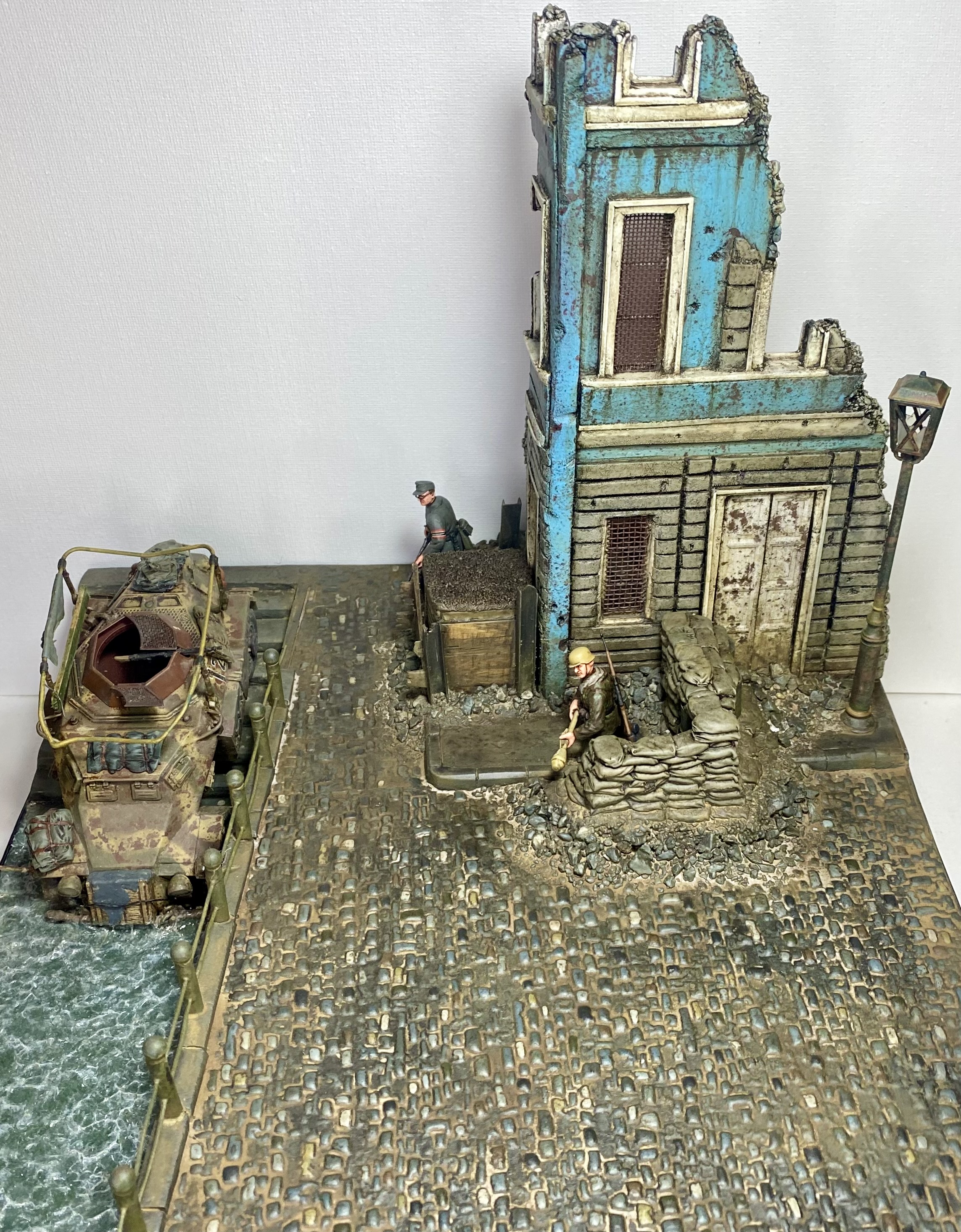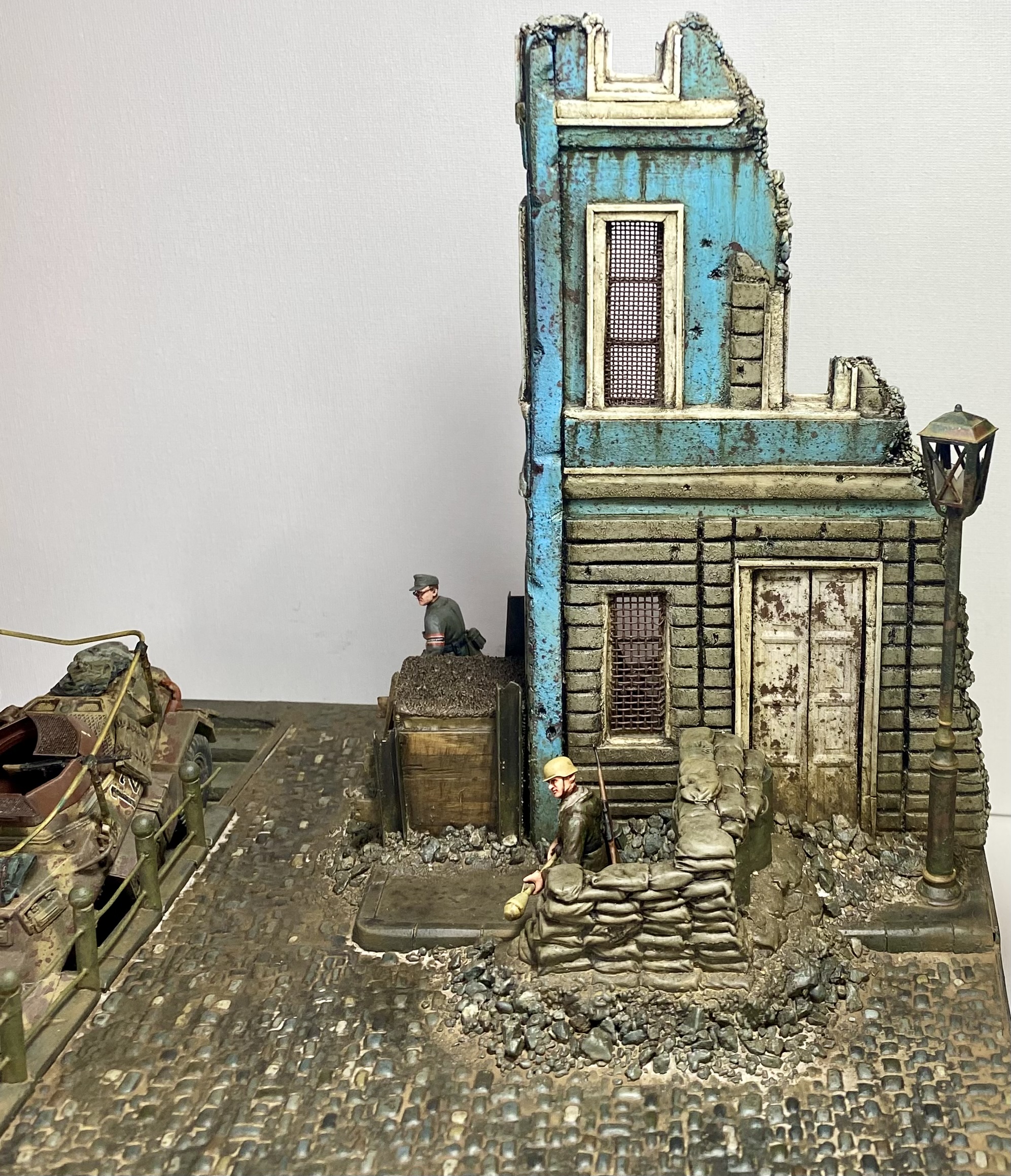 Продолжаем строить диораму, на этот раз контент с домом и забором. Пока только окрасил акрилом и слегка припылил пространство между кирпичами пигментами.