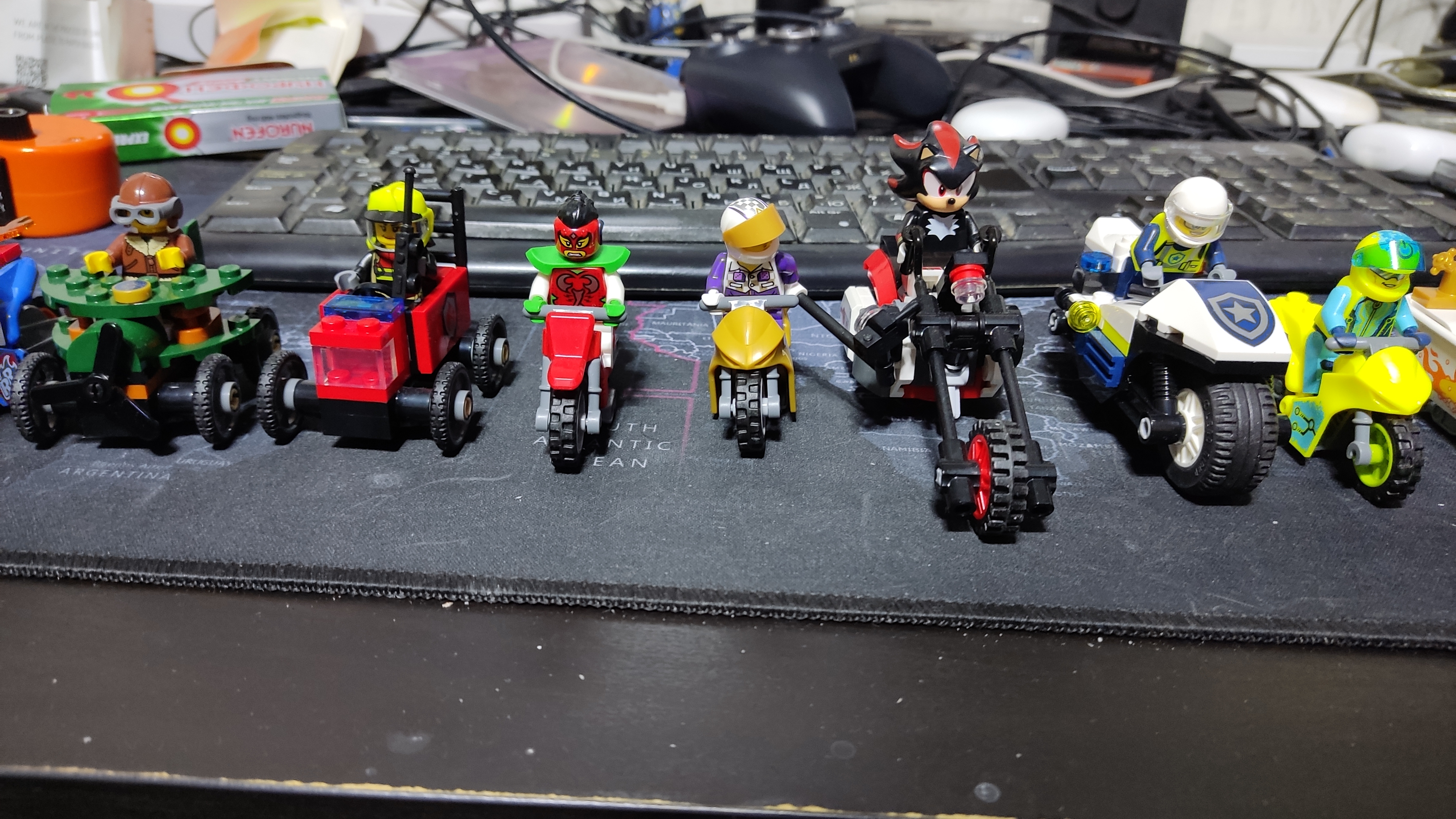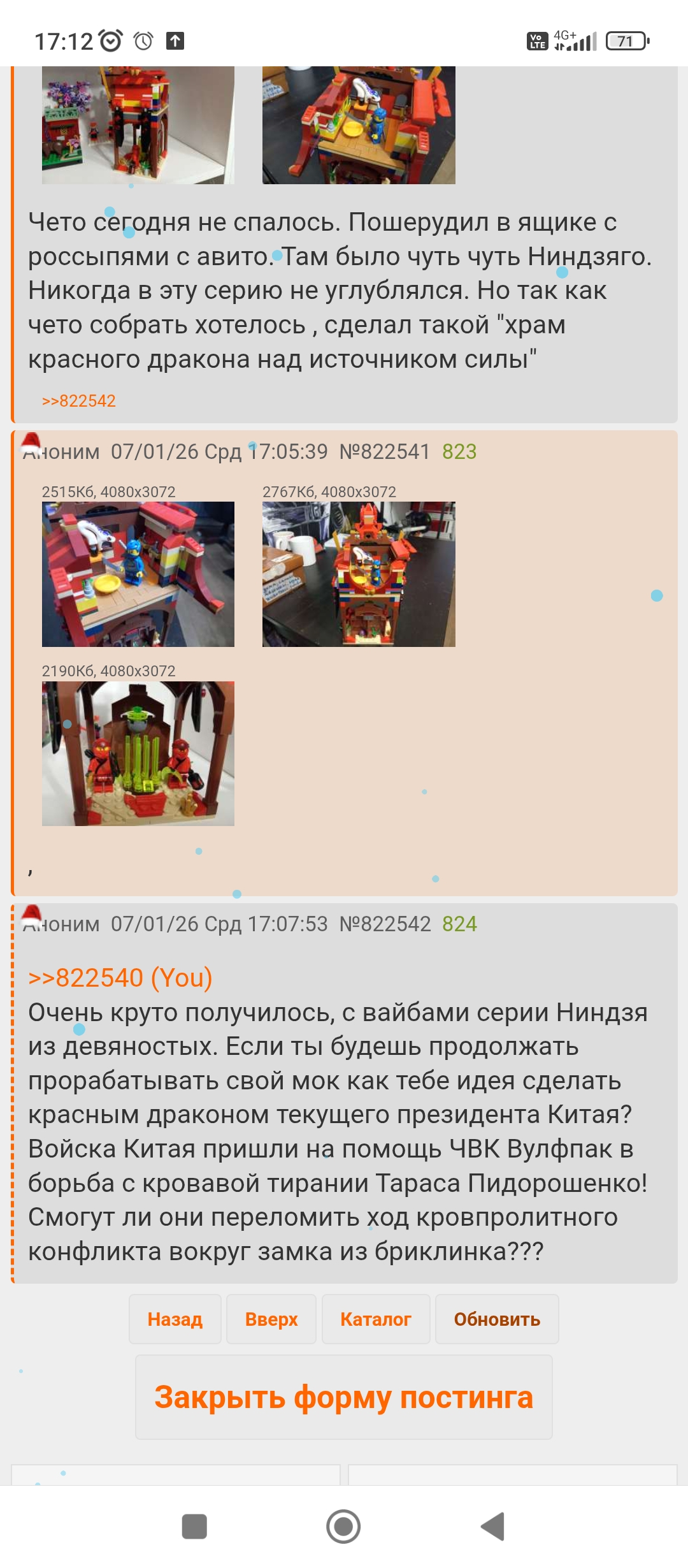 Недавно в плюс набарыжил себе 2 кг оригинального лего. Получилось бесплатно. . Ничего особенного но порадовало что наконец нашел себе из них поводья для лошади и пару нужный деталей. По фируркам негусто. Но зато собралась очень козырная фигурка жрицы туалетных дельфинов. Даже не знаю как обьяснить. Но в общем я поставил ее на полку над толчком. Стоит она на уровне глаз соответственно. И дельфин который у нее на курточке вроде веселый, но ночью когда я хожу в толчек и смотрю на него он не улыбается а хмурится.