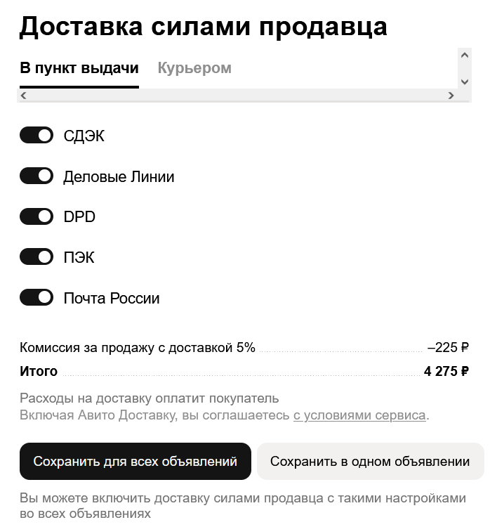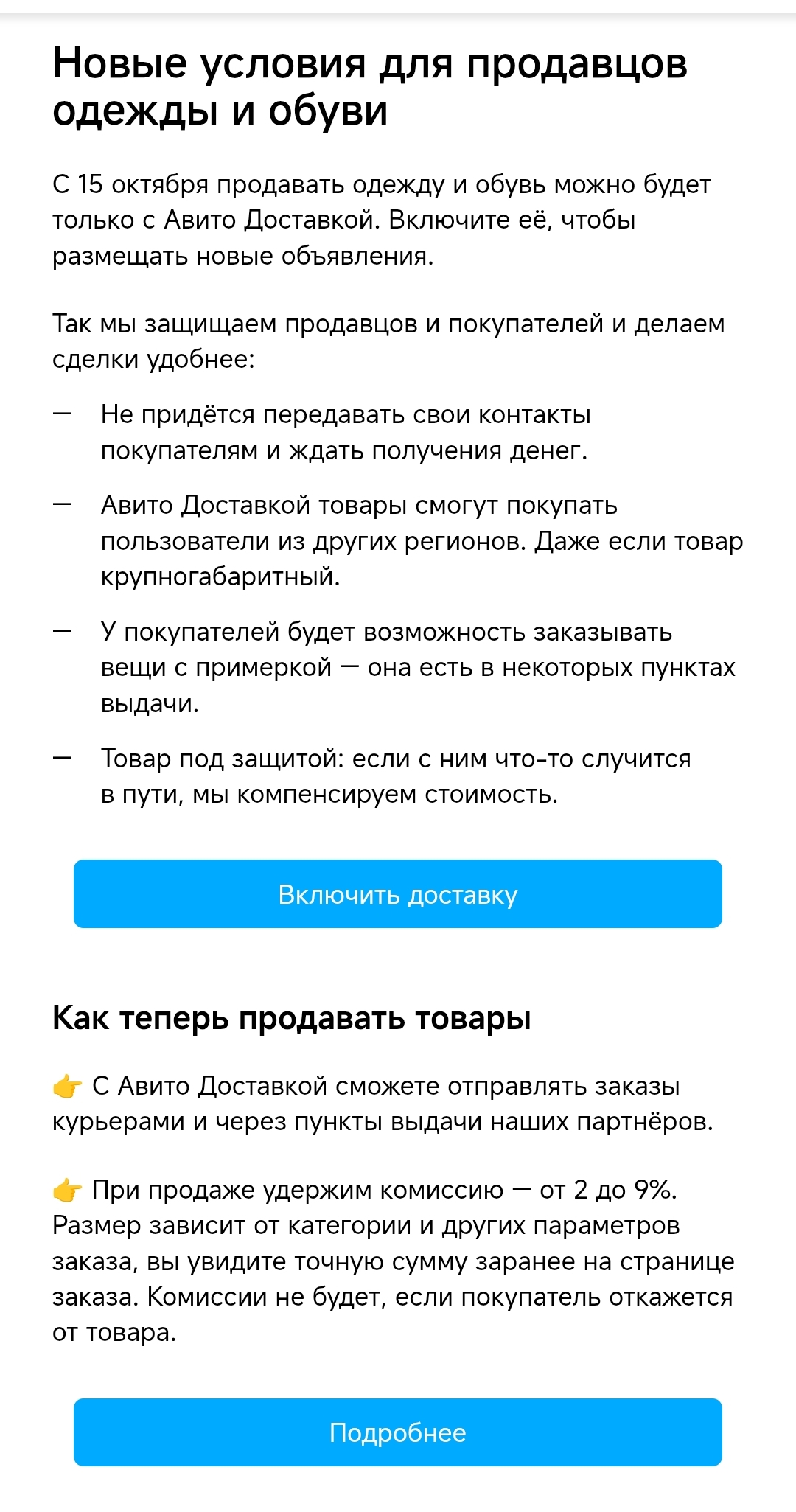 >Можно Вот тебе ЗАДАЧКА тогда. Если активирована "авито доставка" и подключена "своими службами" – как приоритезируется доставка? Через авито доставку можно выбрать СДЭК и через свои службы подключена доставка СДЭК, заказчику-то как будет показаны две доступные опции отправки сдэком? Я с соседнего аккаунта вообще не увидел, чтобы что-то поменялось после включения доставки своими службами