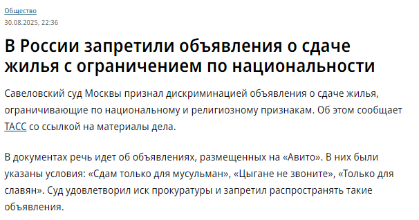 >>812126 Т.е. теперь съем жилья для людей "неправильных" с точки зрения арендодателя национальностей станет еще сложнее - придется как минимум обзванивать каждый адрес или даже тратить полдня чтобы получить отказ под надуманным предлогом? В чем тут логика - жизнь усложнили сразу всем?