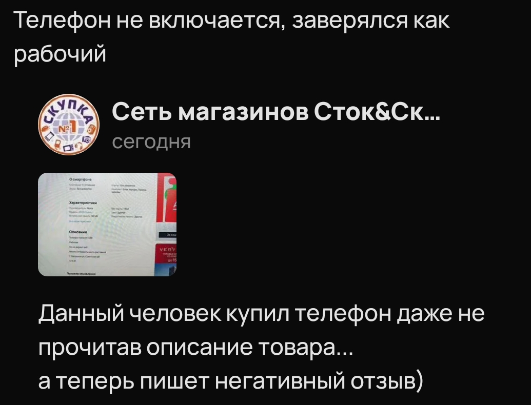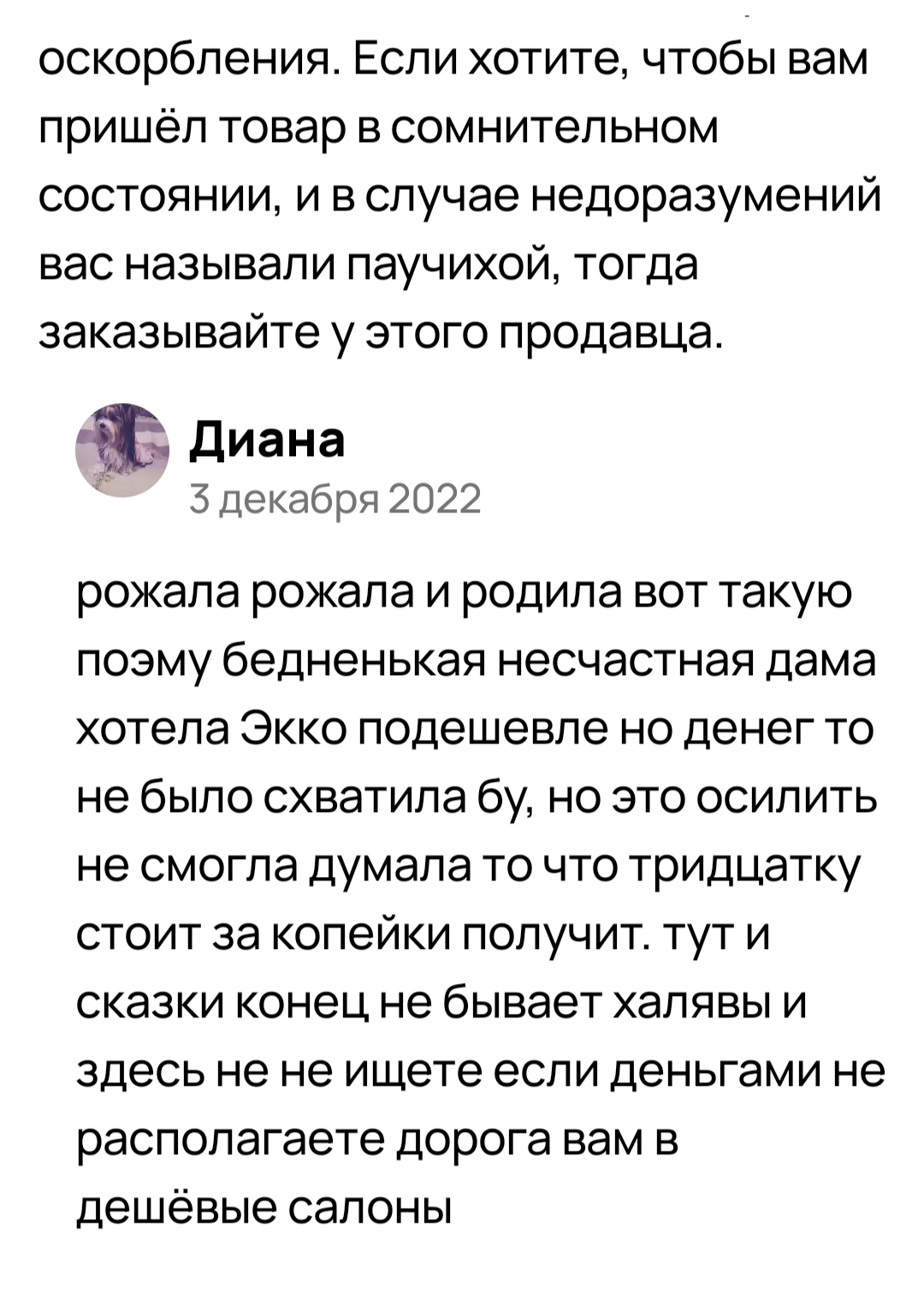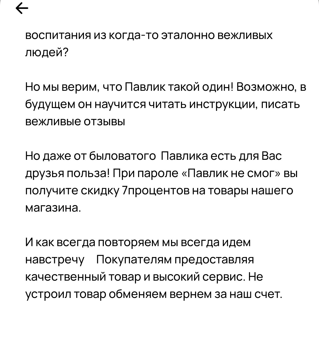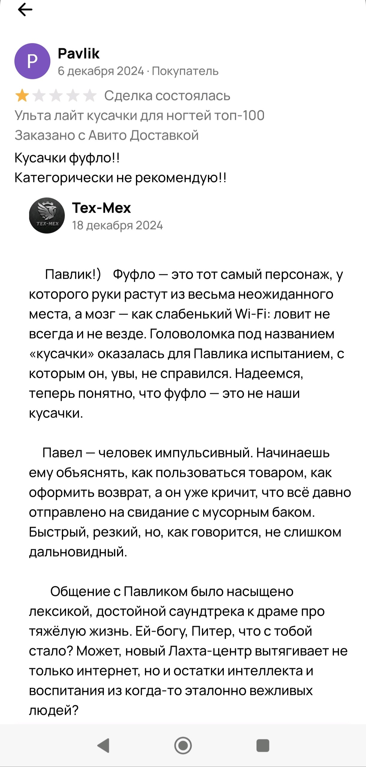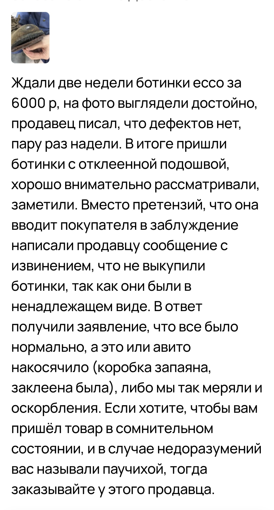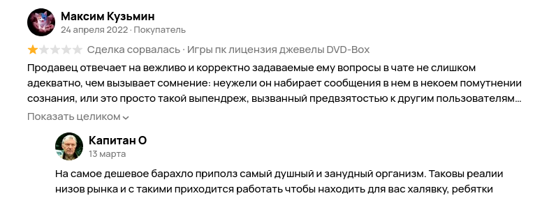 Так что да, покупанов не нужно жалеть, потому что в следующий раз тебе напишут дай скидку, ты не дашь и будет у тебя отзыв висеть "матерится, грубый" и прочее и Авито хуй удалит, ибо мнение.