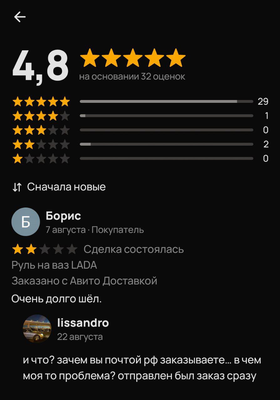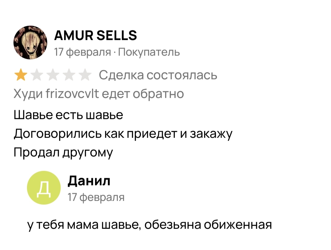 >мне и самому вероятно ебанули бы помойный отзыв в духе "не понравилась" Лично я не трясусь ради отзывов, это во-первых. Во-вторых, если чел не забрал заказ, то авита обычно встаёт на сторону продавца и делает "отзыв без оценки" внизу списка.