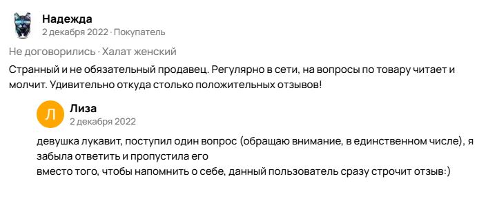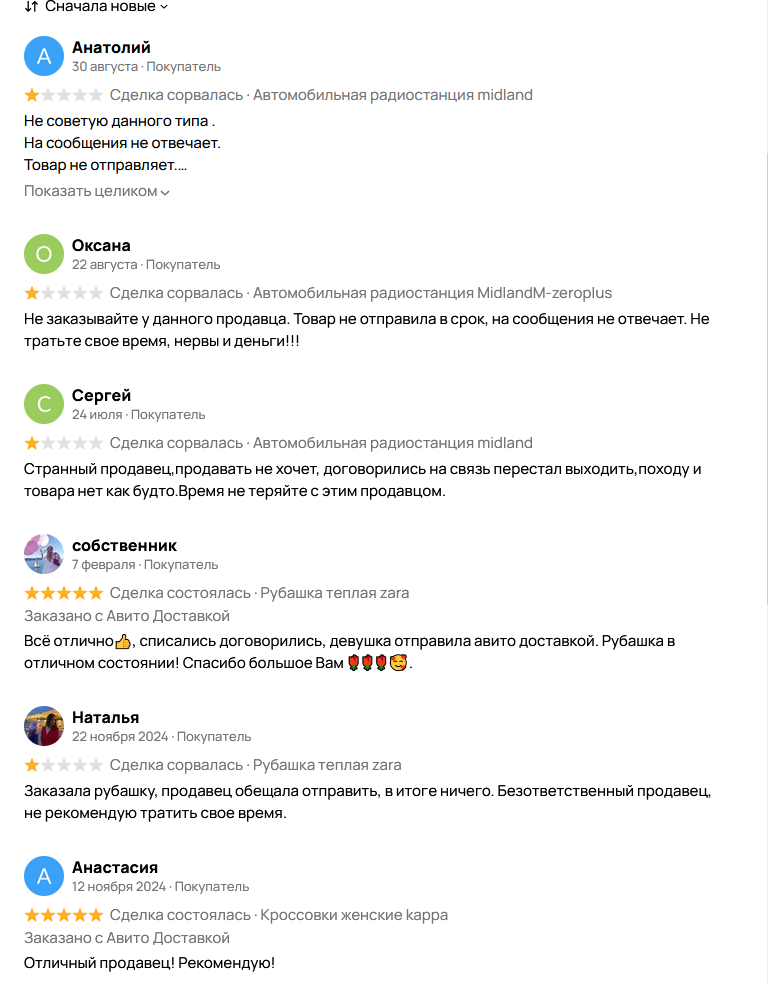 Хз чё вы ссытесь оставлять отзывы. Так вот заходишь в аккаунт покупахи, а там отзывы типа "ёбнутый", "заказал и не забрал", "ебал мозг весь день вопросами, заказал и отменил через два дня, когда пердола уже в пути", "вместо А прислал Б" и так далее по списку. Сразу блочишь дурачка и всё, даже время не тратишь на него.