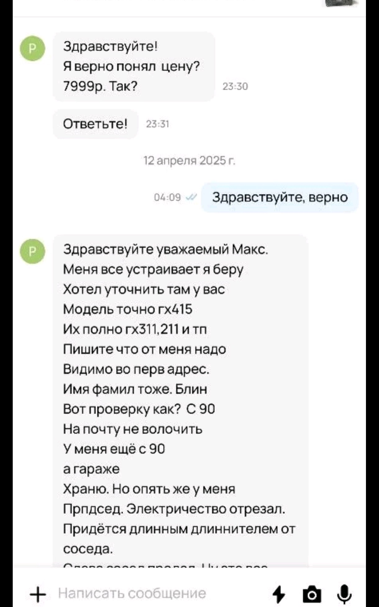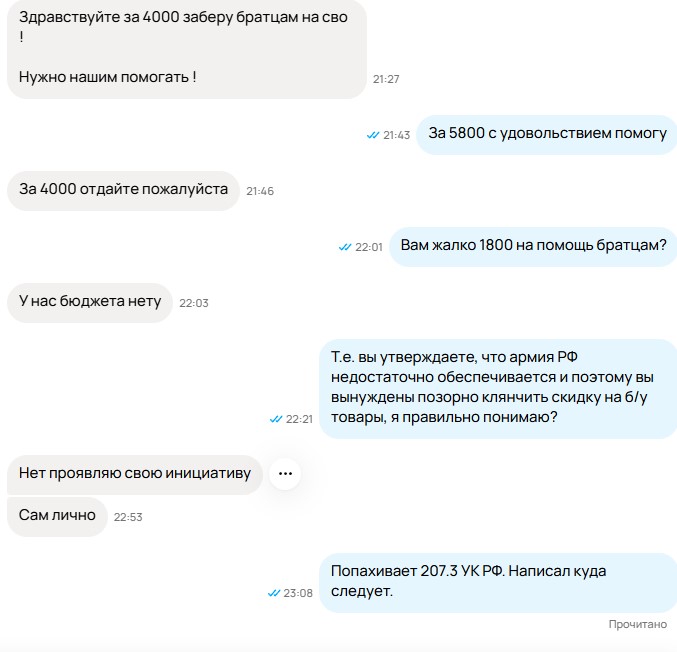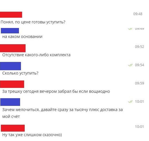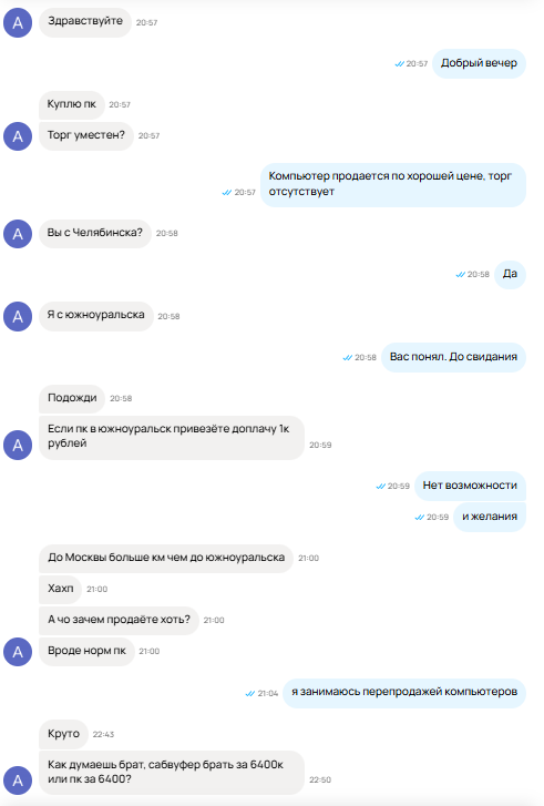>>815671 Мне вообще похую тащем-то на то, где он живёт и на его предложения. На авито я встраиваю диалог максимально не занимающий мои мозговые ресурсы: не оправдываюсь, не вкладываюсь в диалог и не рассказываю охуительные истории про пердолу (для историй есть описание). Такие типы как этот, судя по моему опыту, будут мусолить мозги до тех пор, пока им не надоест и по итогу нихуя не купят, на чтои намекает его последнее сообщение. Авито - это стиль общения, стиль общения официально-деловой, без своей, никому не нужной хуйни, и без своих никому нахуй не нужных южноуральских проблем. Буду я ещё логистику ему прокладывать - ХУЙ пусть лучше насасывает, раз не умеет ценить чужое время.
