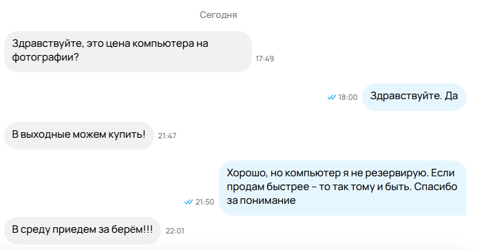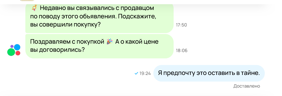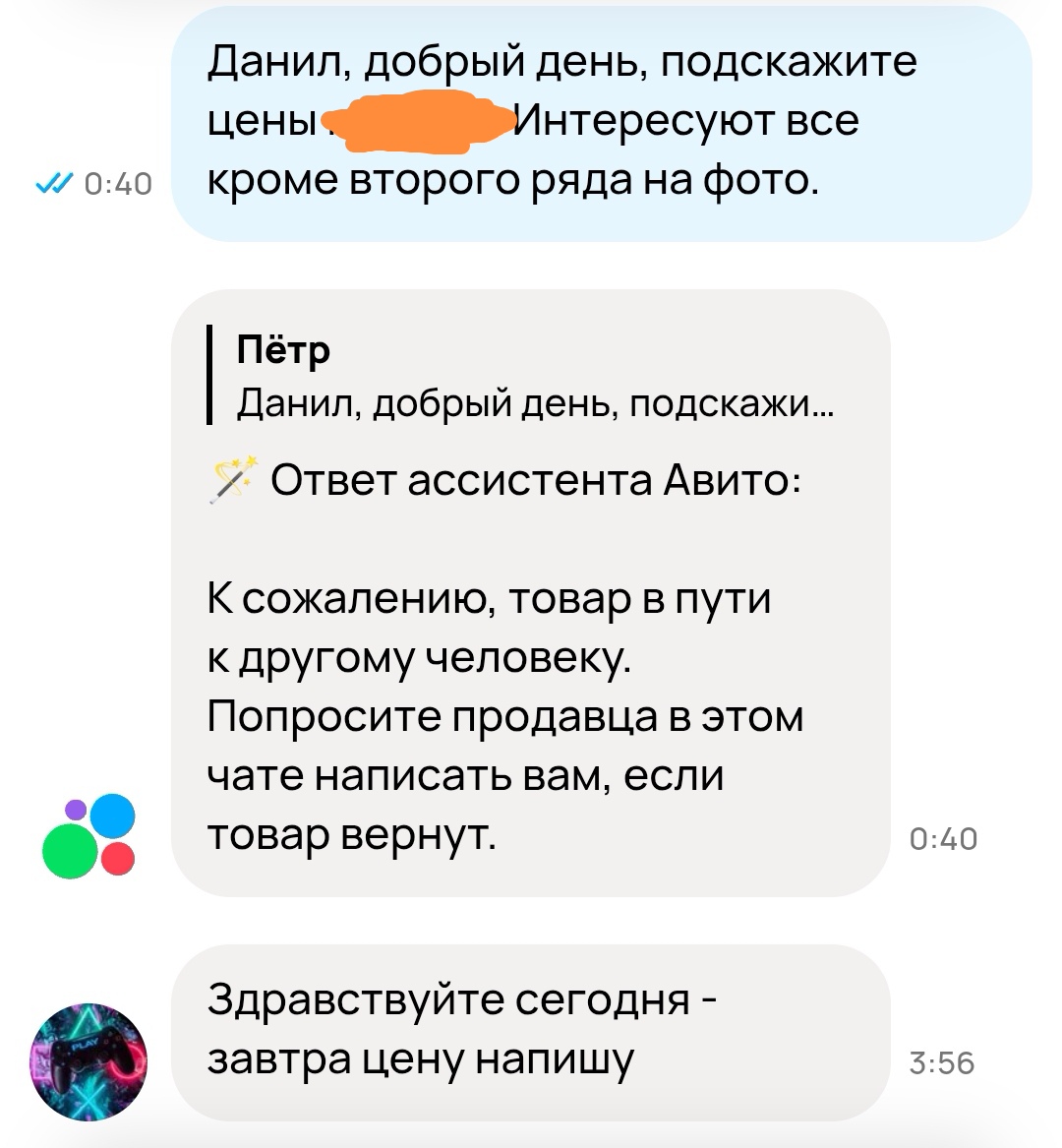 В: На авито приходят сообщения типа "еще продаете" или "отправите доставкой", отвечаю и дальше меня всегда игнорят, как быть? О: Гении из авито сделали кнопки для начала диалога, покупатель случайно их нажимает. Терпи.