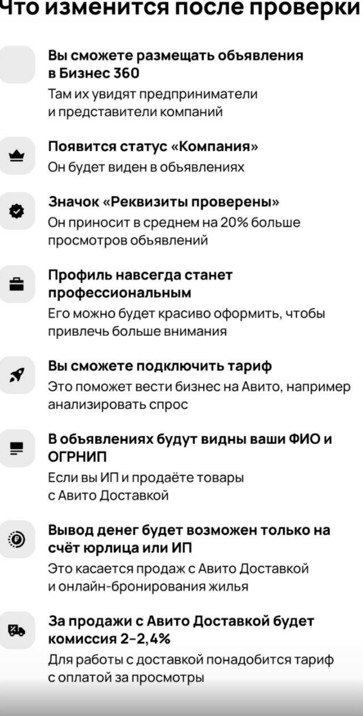 На что влияет профессиональный профиль? Кроме того, что по йоба-статистике приносит на 11% больше просмотров и профиль имеет особый "профессиональный" вид с возможностью прикрепить к нему пикчи и написать подписи? Имею ввиду, может быть, там, продавать авито-доставкой становится дороже, или, может быть, выставление обьявлений становится дороже? Или через госуслуги верифецировать аккаунт придется