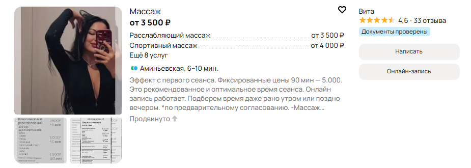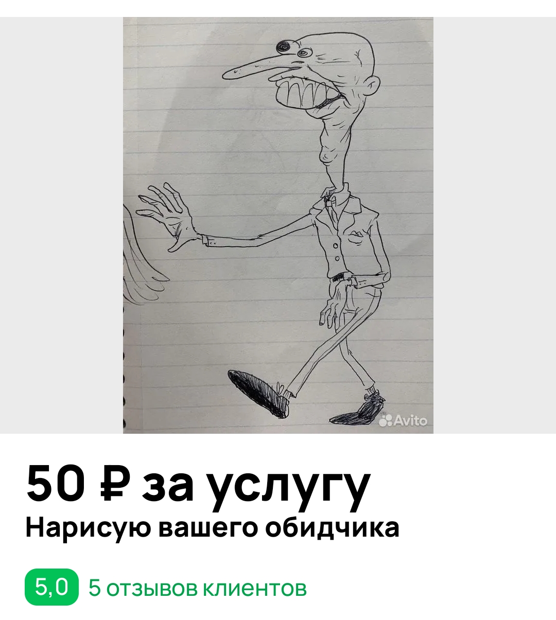 >>815278 Ну а худи делать. Формально, опять же, можно обыграть просто – вот на картинке примеры работ/прайс/варианты услуги, а заодно на ней же прямые контакты для связи, например. Но это всё так, ёрзанье жопой. Я просто копукателям говорю, что можно свободно покупать по текущему объявлению. А если хотите чего-то помимо (больше/меньше/круче/быстрее) – обсуждения только за пределами авито. Итого: на авите предлагается то, что я готов предлагать на авите, всё остальное к авите отношения не имеет и если у заказчика возникло желание отклониться от базового объявления – это не дело авито и не моя вина