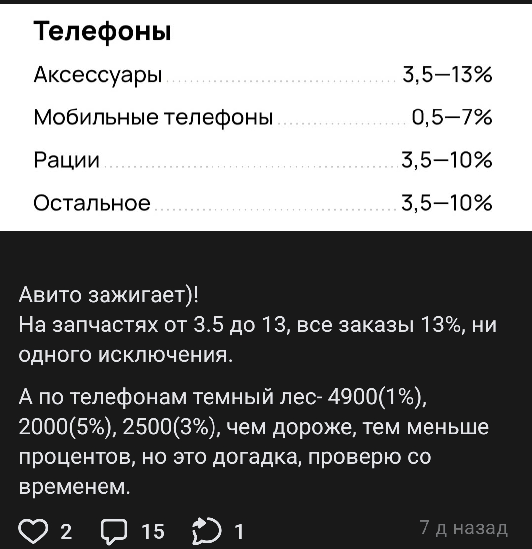 >>811966 >По сравнению с обычной доставкой >у меня по крайней мере так Ну это одна из причин по которой я особо про комиссии не рассуждаю – во-первых они у всех могут быть разными, во-вторых даже у меня на каких-то объявлениях комиссия нулевая, на других – 0,5-1%, на третьих – в районе пяти При этом мои объявления живут годами и их немного, т.е. к ним могут применяться свои алгоритмы (1000 дней публикации+). Потыкался по своим объявлениям, менее ходовым – да, можно на каких-то отдельных комиссию с 2,5% снизить до 1% или типа того, но это в целом так себе плюс один хуй