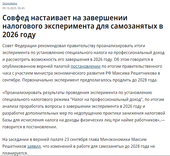 Российские власти приближаются к решению об отмене режима самозанятости уже в 2026 году. Если ранее чиновники обещали сохранить этот инструмент до 2028-го, то теперь Совет Федерации рекомендовал правительству ускорить завершение эксперимента.