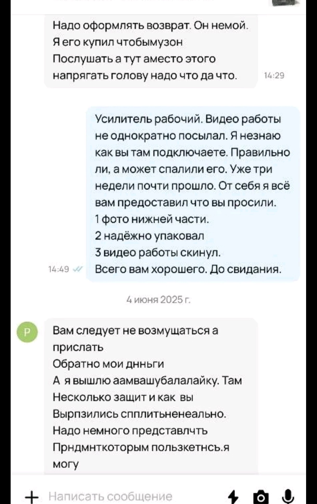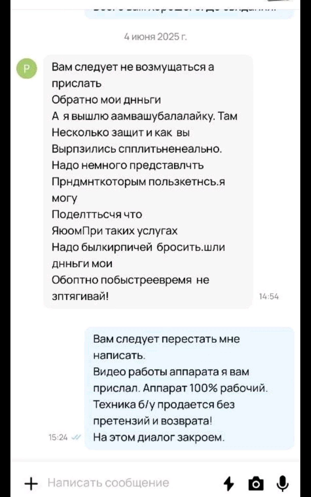 Я продавал пердолу за 900 рублей. Заказал какой-то иностранный специалист, и при получении начал писать что с ней какие-то проблемы. Я пытался ему помочь, объяснить что все норм. Тем более в описании было все недостатки расписаны. В итоге все равно отказался и не забрал. Неприятно? Да. Но я не злился а просто забил, пердола вернулась, ее заказал адекват и забрал в итоге.