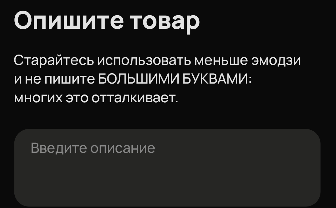 Продаёшь хуйню с помойки, собранную из говна и палок - так и пиши об этом прямо, честно описывай все дефекты и нюансы.