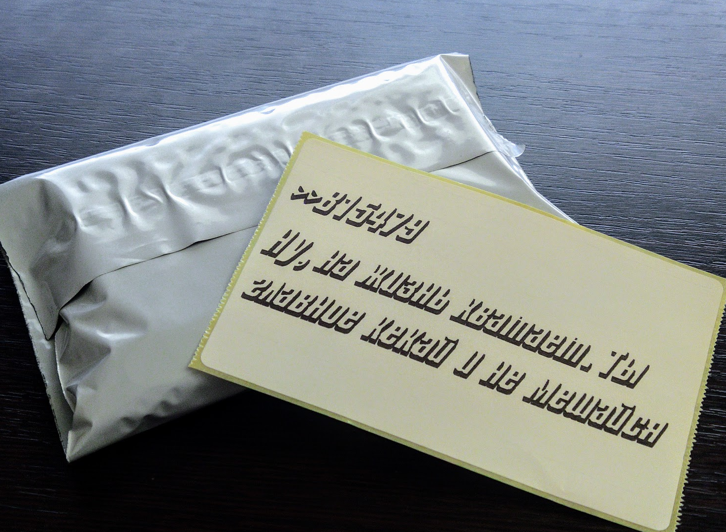 >>815484 Обзор от ИИ На изображении показан пакет с вложенной в него открыткой. Надпись на открытке выполнена стилизованным шрифтом и содержит фразу на русском языке. Текст написан заглавными буквами и имеет тень, что делает его похожим на логотип или мем. Фраза является цитатой из популярной песни.