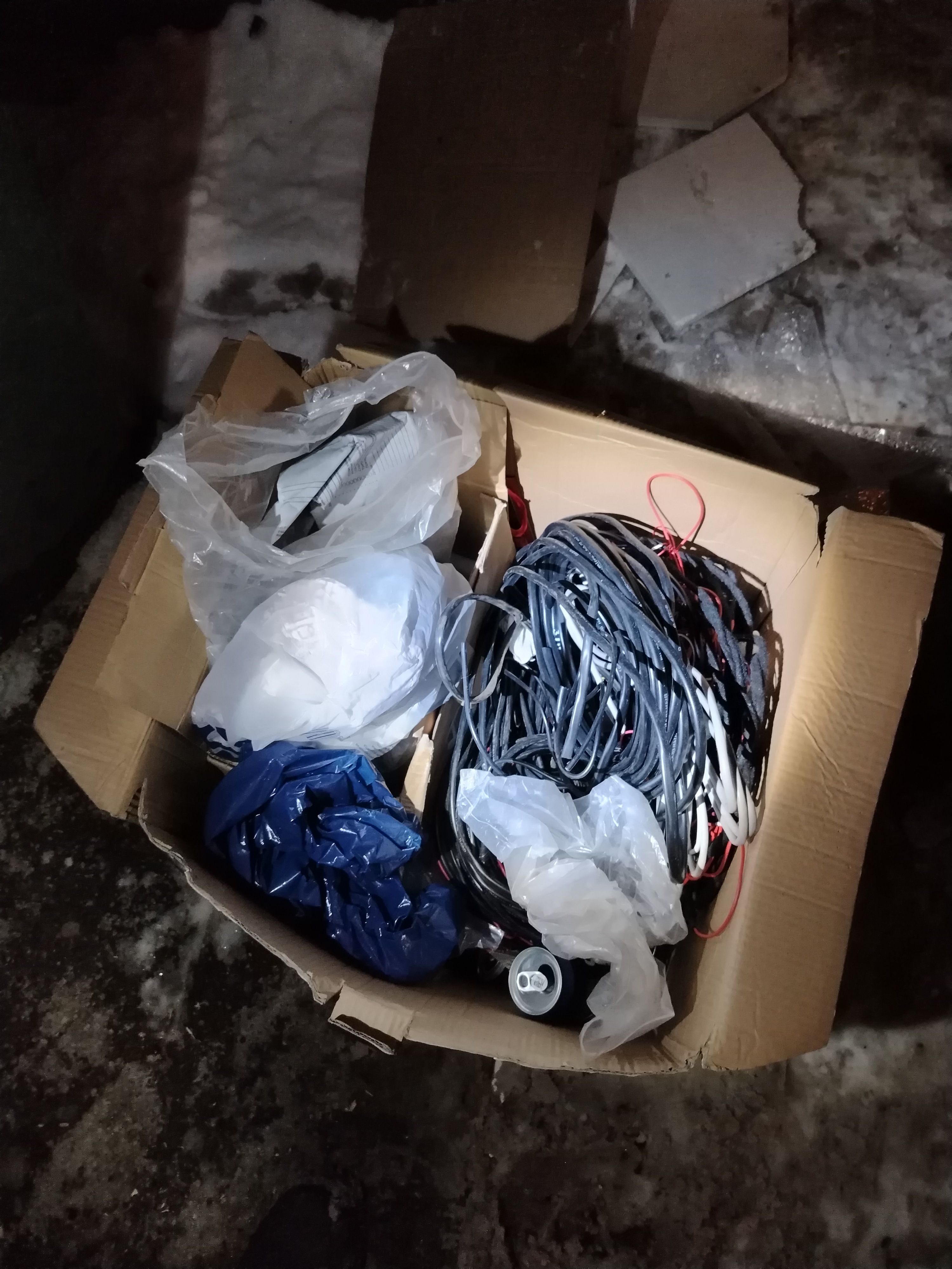 В итоге стабильно хоть что-то даёт одна площадка в центре, которая среди самых обычных старых пятиэтажек с самыми обычными жильцами. Уловы там - разбитый системный блок, из которо целой была только передняя панель, пакет с фигурками из киндеров, метра 3 старого антенного кабеля, 5 небольших советских плиток с остатками клея. Ещё встречал там, но не взял - большую коробку с дивиди дисками, девчачий школьный ранец, набирай дивиди дисками, разбухшие от влаги старые фанерные ящики от шкафов, битые и мятые пластиковые панели... Уловы в других местах (тоже обычные кварталы) - гуашь, половина часть банок которой - пуста (её я выловил чуть ли не на дне бака, когда вечером безуспешно погружался в около 50 баков), автомобильный сгоревший и окислившийся антирадар без блока питания, автомобильный держатель смартфона на присоске, 5 образцов плитки из керамогранита с мелкими дефектами в углах (но её я по факту ночью просто упёр у чёрного входа строительного магазина; похоже, кто-то из персонала решил забрать себе и оставил за магазином; я взял только треть из всех образцов)... Ещё в этих кварталах попадались однажды - коробка с какими-то шмотками, пакет с дисками, какой-то мятый и с облетевшей местами краской детский стул, изорванные в хлам кресла и диван, разбитая и поломанная фанера, камера от велосипедного колеса, плкстиковый игрушечный калаш в нерабочем состоянии. Но это я не брал.