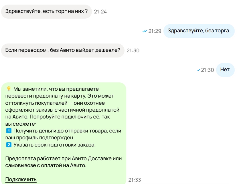 В: На авито приходят сообщения типа "еще продаете" или "отправите доставкой", отвечаю и дальше меня всегда игнорят, как быть? О: Гении из авито сделали кнопки для начала диалога, покупатель случайно их нажимает. Терпи.