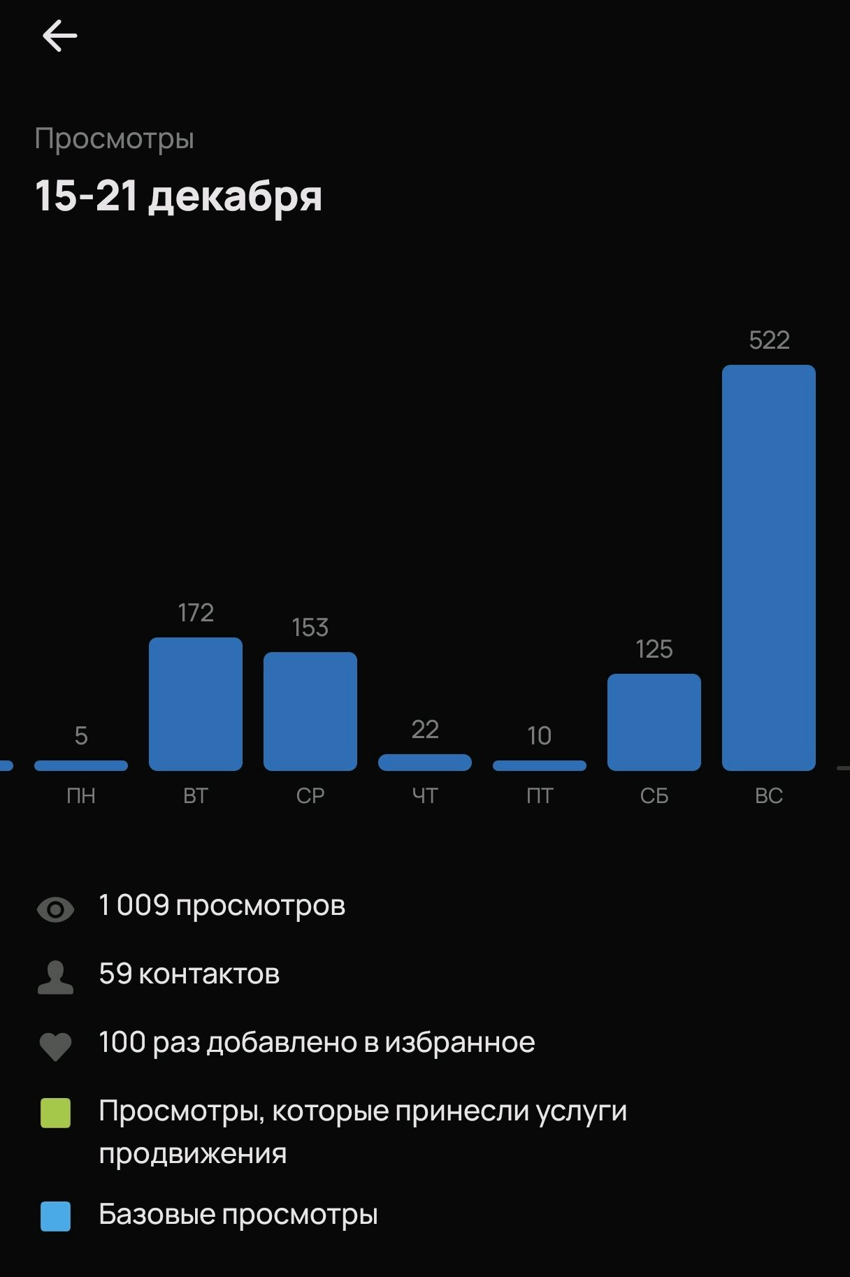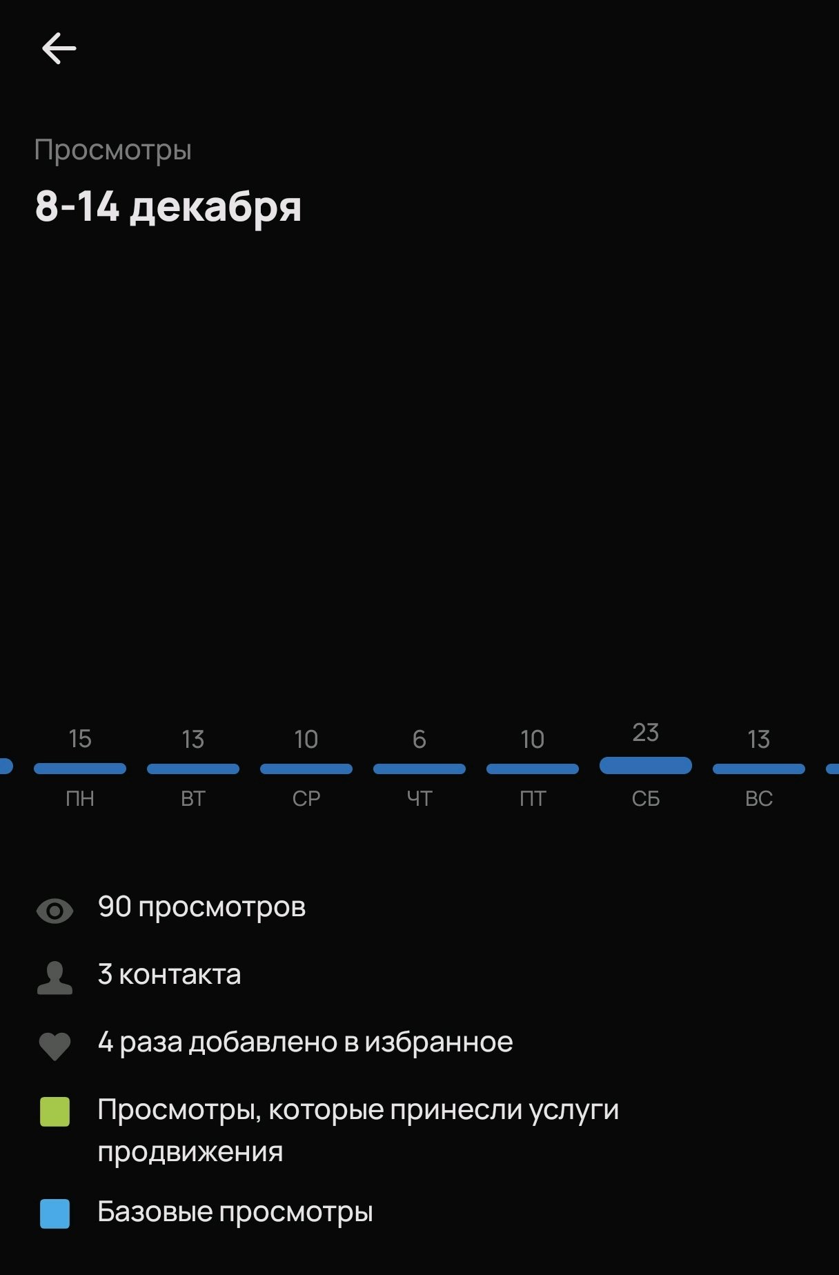Первый скрин стата по платному объявлению. Второй скрин тоже платное, кроме воскресенья. Изредка давали по 20-30 контактов, которые тратились за сутки. На бесплатных объявлениях лимита контактов нет, люди могут писать неограниченное количество раз. Эти лимиты контактов максимально тупорылая система. Бесплатно ты получаешь больше, чем платно. Как бы грех жаловаться конечно. Но это просто тупо. Ты платишь деньги, а получаешь хуй за щеку. Люди просто перестанут же донатить или Авито готовится полностью убрать бесплатные размещения и тогда хуй будут сосать все перманентно без смс и регистрации?