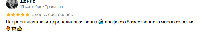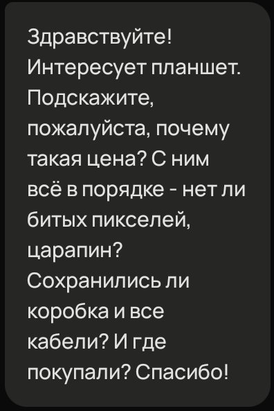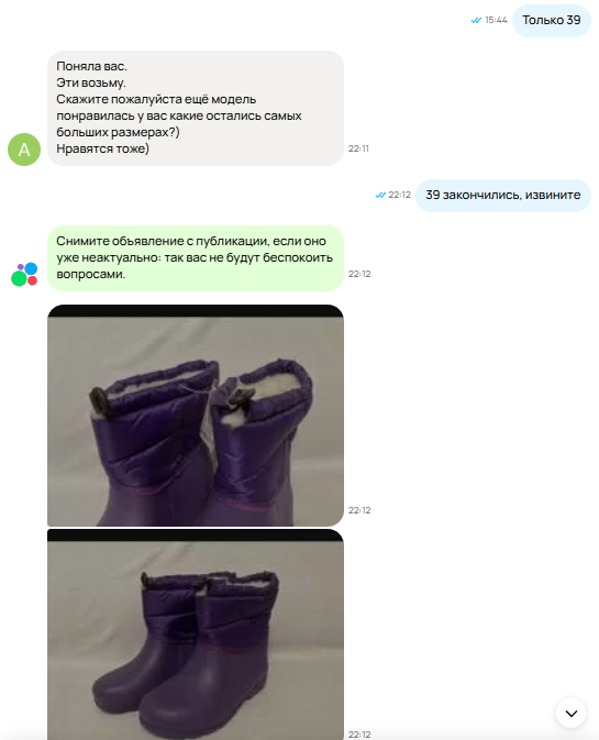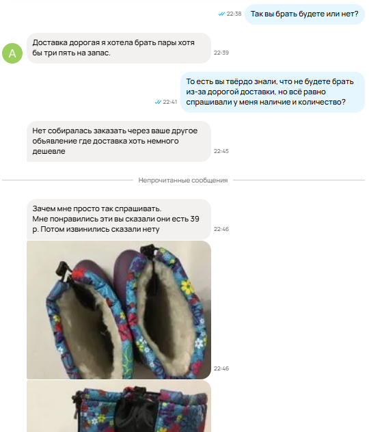 Вот буквально диалог пары дней назад. Чел пишет, задаёт вопросы и пишет в конце Возьму, но ещё хочу вот ту пердолу. И пишет мне в другом объявлении уже. Я там ему ответил на вопрос и пишу в том где он сказал Возьму - давайте бронь вам поставлю, чтобы другой не купил. И что ты думаешь? А ничего. Он просто перестал отвечать по середине диалога. Вот просто не ответил и всё. Т.е. ему больше неинтересно при том, что он сказал что уже берёт. Чем ты от него отличаешься? Телепатов нет, что вы там хотите.