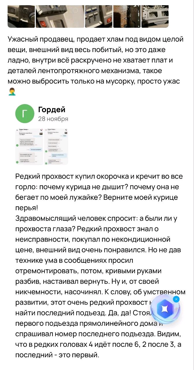 Блять, я ебал. Пишет девка: "ой а я хочу заказать у вас %пердола нейм%, но у той объявы доставка дорогая, давайте на этой закажу". Я согласился, мне похуй где закажет. Сказал, что щас цену поменяю - и пускай оформляет. И в итоге девка молча заказала на той объяве, где "доставка дороже", а почему? Потому что там цена ниже стоит (разная стоимость товаров ебать). Не оценил прикола, отменил заказ, жду 1 звезду.