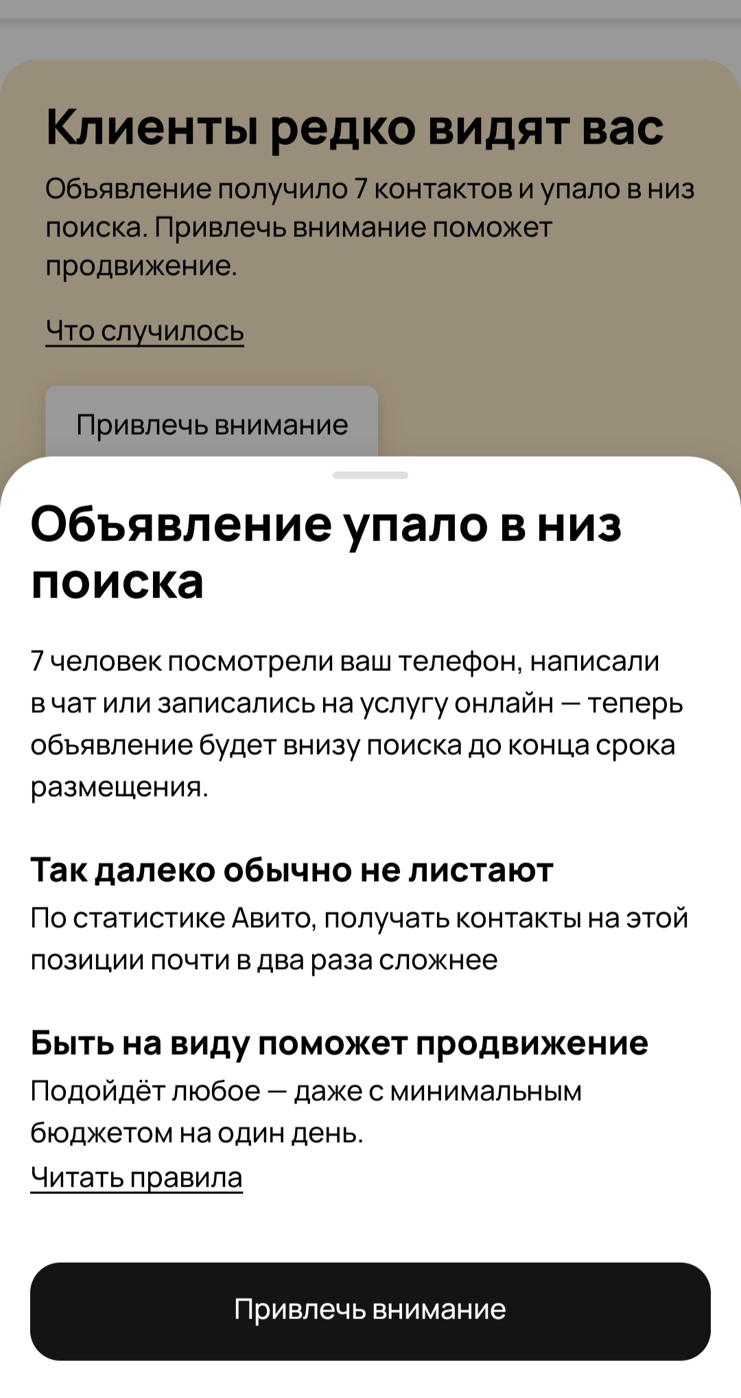>>821115 Теперь блять за ПОИНТЕРЕСОВАЛСЯ в некоторых категориях есть счетчик лимитов. Несколько таких интересующихся и твоё объявление летит вниз списка.