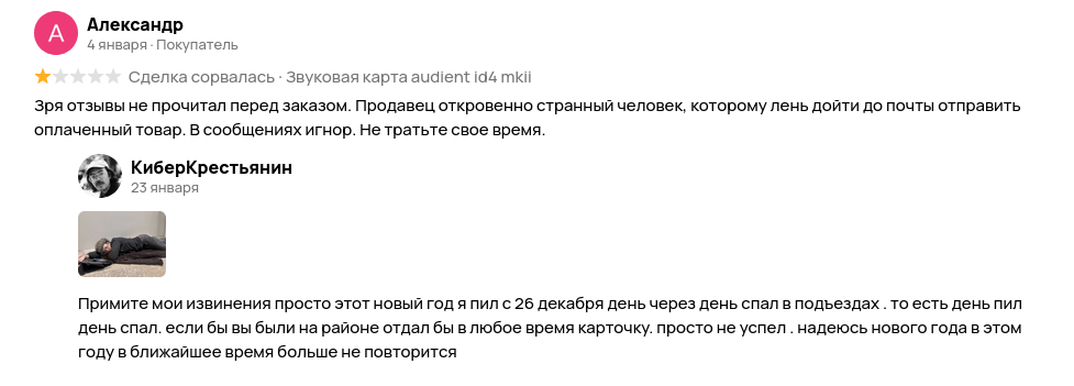 >>822808 Это народ меня скамит, когда что-то заказывают через говниту-доставку, я подготавливаю товар, а они его отменяют или не забирают. Предоплата это гарантия, что быдло, разбалованное отменами на маркетплейсах, вообще заберёт заказ
