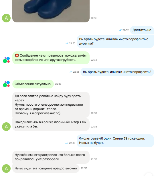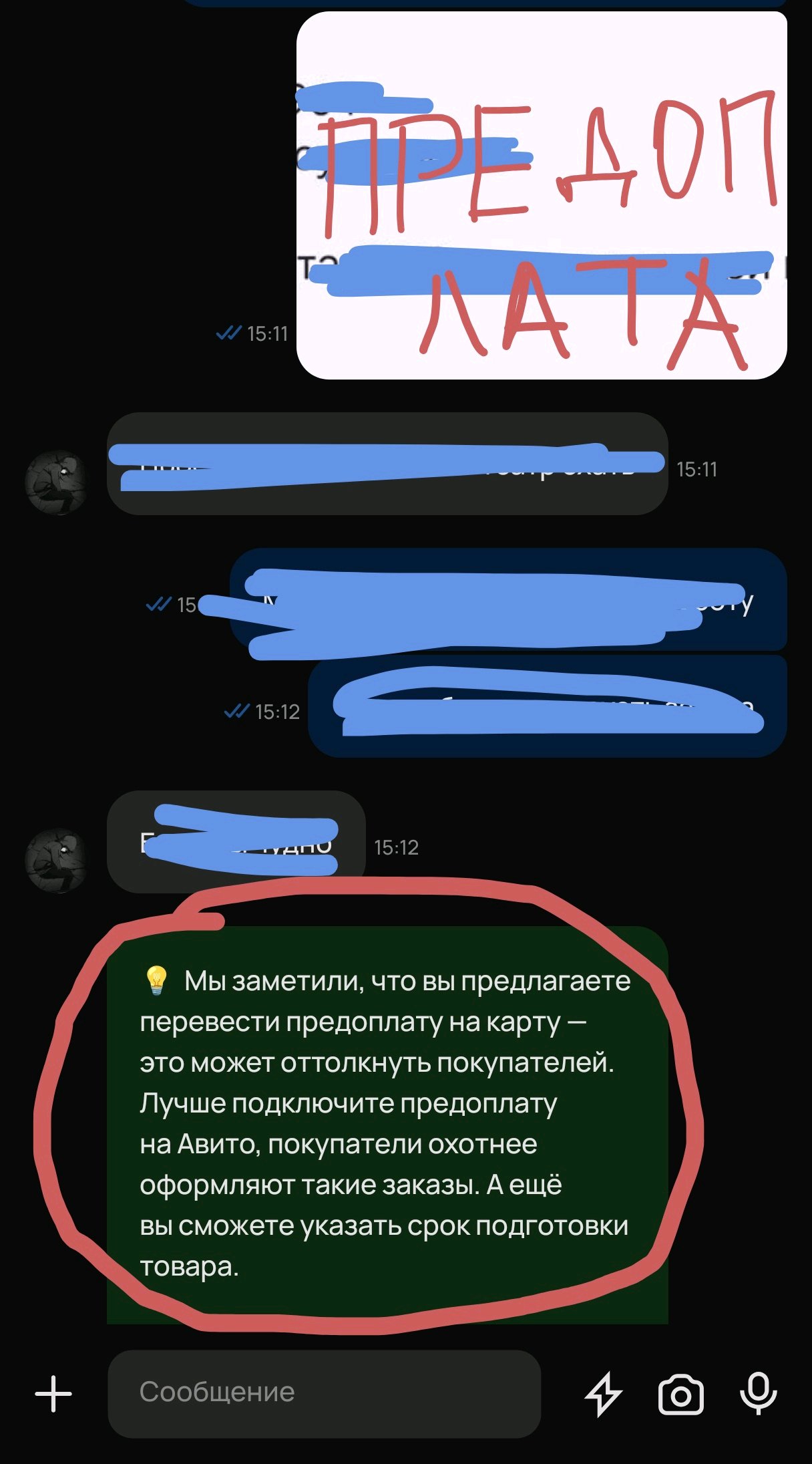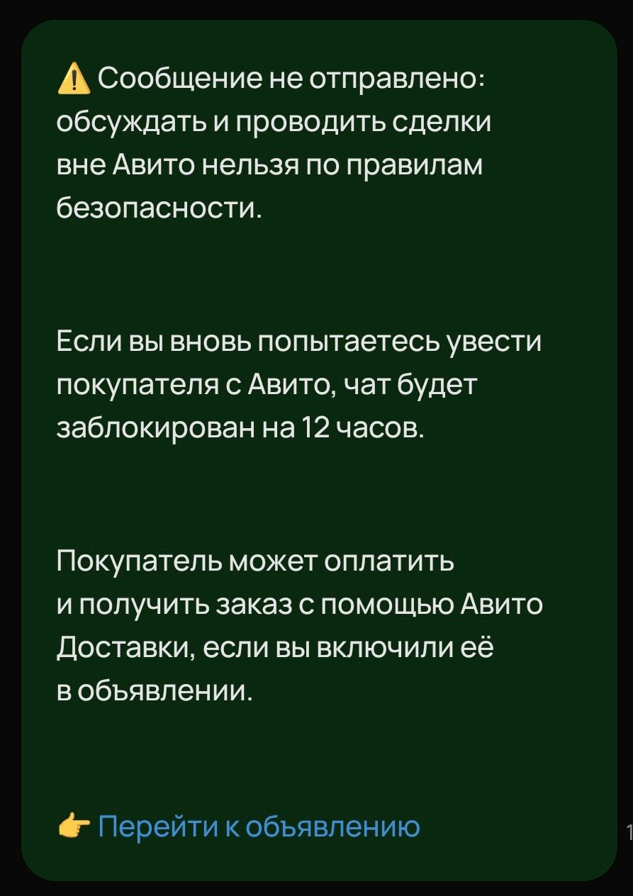 И кстати, первый раз прилетело предупреждение в чат, что мимо доставки продаю. При этом на момент первого сообщения от покупа доставка была включена. Значит уже не имеет особого смысла её выключать, когда переписываешься и просто ныкать цифры телефона на фотке или ещё как. А в тех где доставка выключена вообще ни разу не прилетало ещё.