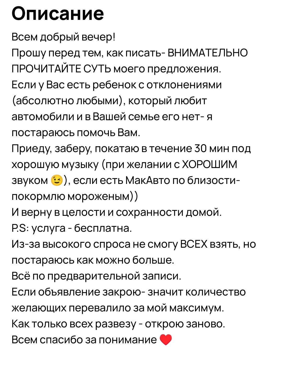 Или ещё - Заберите кто-нибудь мой хлам, отдам бесплатно. Выбросить не могу, тяжело нести... И второй день не отвечает, не берет трубку. Объявление болтается недели 3.