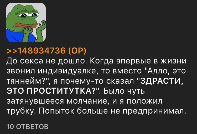 >>823271 Да пиздец. Как-то хотел купить футболку, нужная оказалась только у какой-то тян, объява относительно свежая. Пишу "здрасте, хочу заказать, то-сё" - тишина пару часов, полдня, день... хотя заходила за полчаса до того как написал. Думаю ну ладно, может нет уведомлений с лохито, завтра мб зайдёт? Хер. Зашла ответила через ТРИ недели, мол ой прастити извинити, я чот забыла про авито, вам ещё нада?? Блядь, ну конечно человек за 3 недели а) не передумает б) не найдёт в другом месте, если прям так нужно, а товар не единственный в стране.