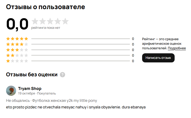 В: Покупатель ебанат и поставил мне единичку. Авито не хочет удалять отзыв, отвечая то, что покупатель имеет право на своё мнение. О: Ты должен понятно и доходчиво обосновать мадине, если отзыв не соответствует действительности, вводит в заблуждение, оставлен хуем с горы, с которым не было ни товарно-денежных отношений, ни договорённости о них.