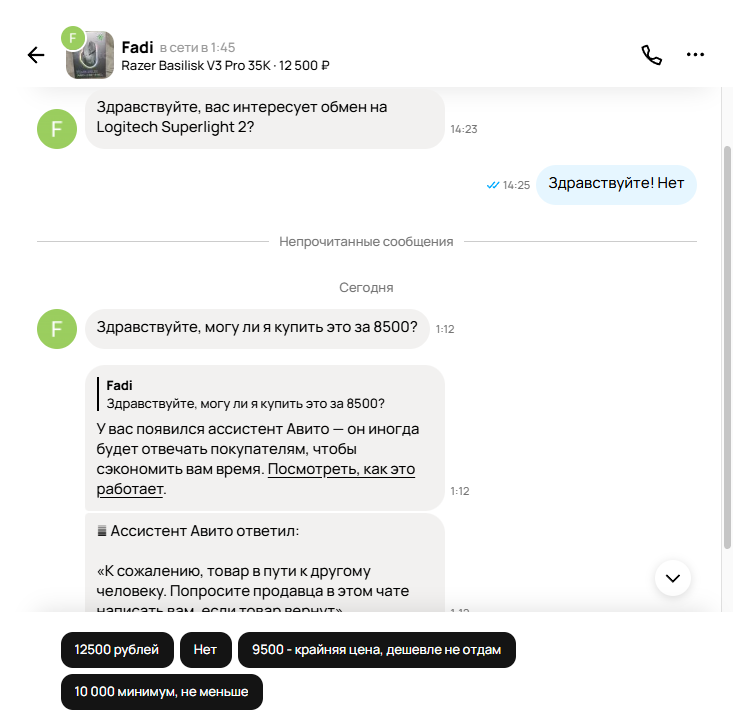В: На авито приходят сообщения типа "еще продаете" или "отправите доставкой", отвечаю и дальше меня всегда игнорят, как быть? О: Гении из авито сделали кнопки для начала диалога, покупатель случайно их нажимает. Терпи.