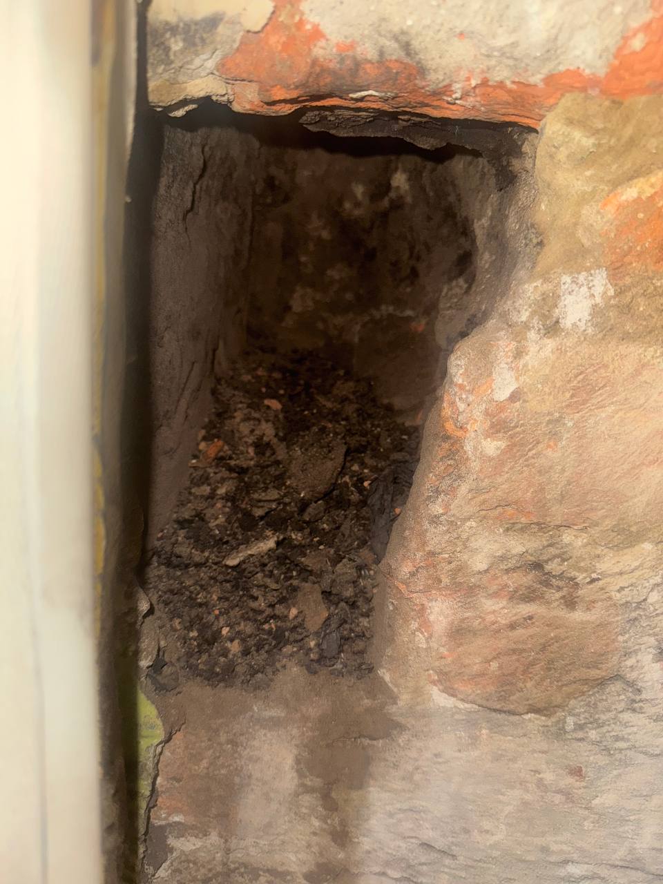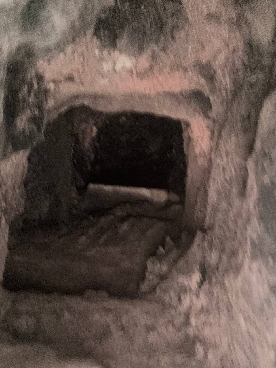 Крч снимал штукатурку и нашёл внизу дырку, заделанную штукатуркуой и ссаными тряпками. Внутри завалена какой-то землёй и судя по всему углём с сажей. Вентиляционное отверстие находится выше и правее, от него никаких ходов вниз нет.