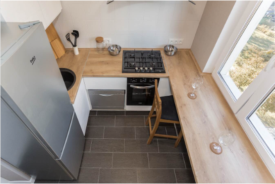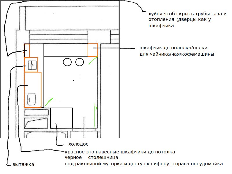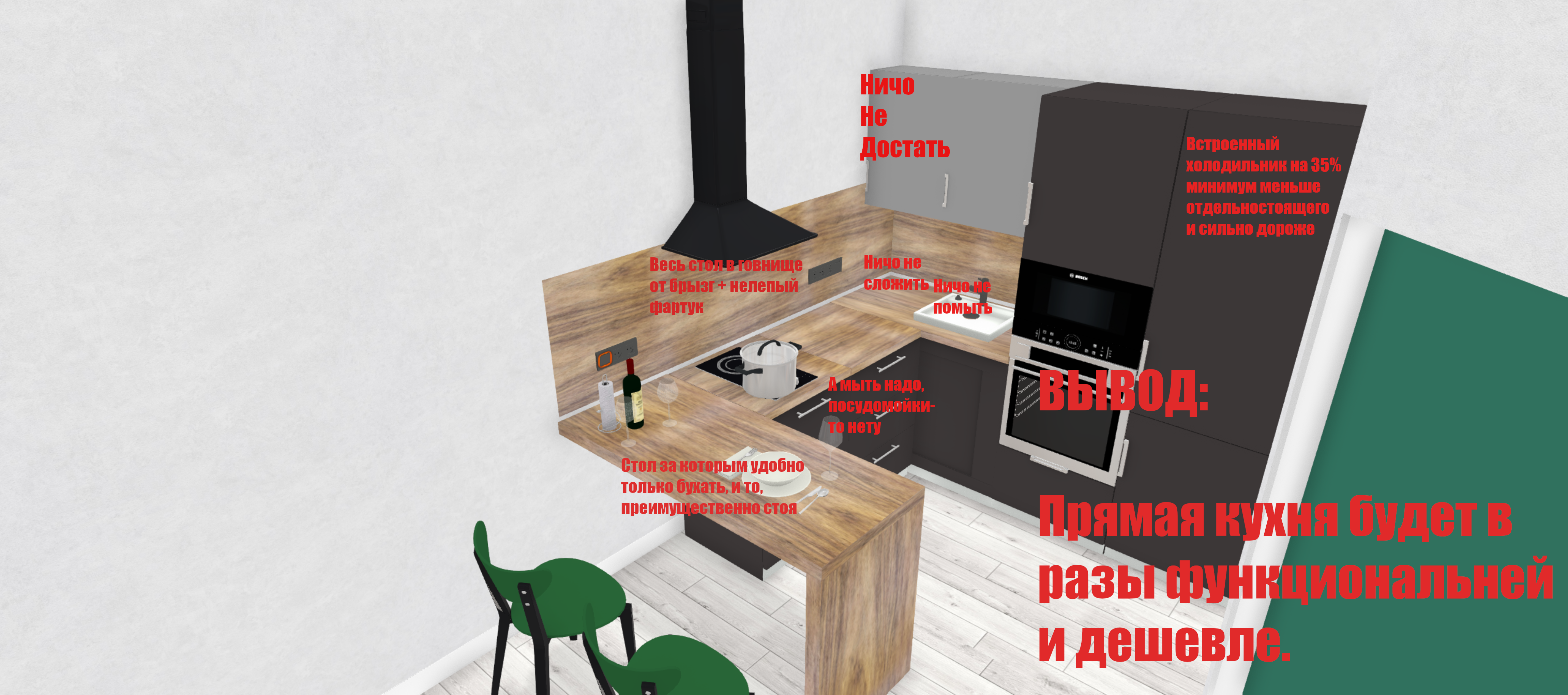 У большинства микроволновок петли слева, значит справа должно быть место, куда ставить хрючево. У тебя она запхнута впритык к холодильнику, хуй чо куда поставить. Мойка в углу - говно, страдание на всю жизнь. Угол мёртвая зона, в нём только хранить хлам, можно микроволновку поставить ребром, но мойки пихать туда - уебанство.