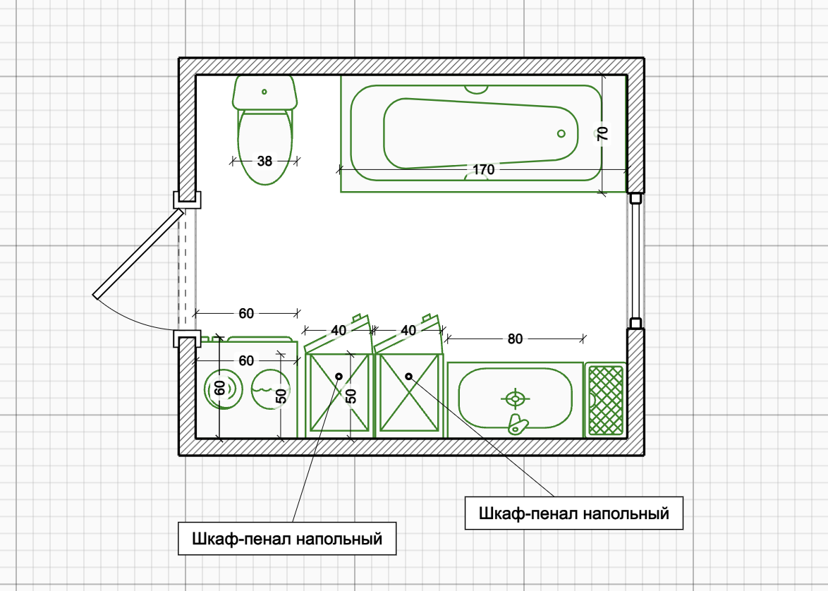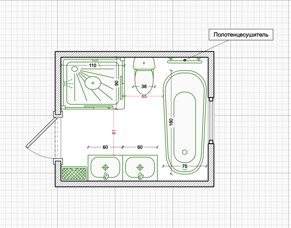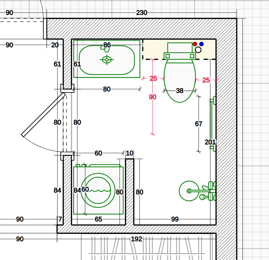 >>282837 >>282777 Спасибо большое. Получается лучше забить на "хочется раковину с зеркалом напротив входа" и делать как-то так. Душ не отрисовал, рисовалка денег просит.