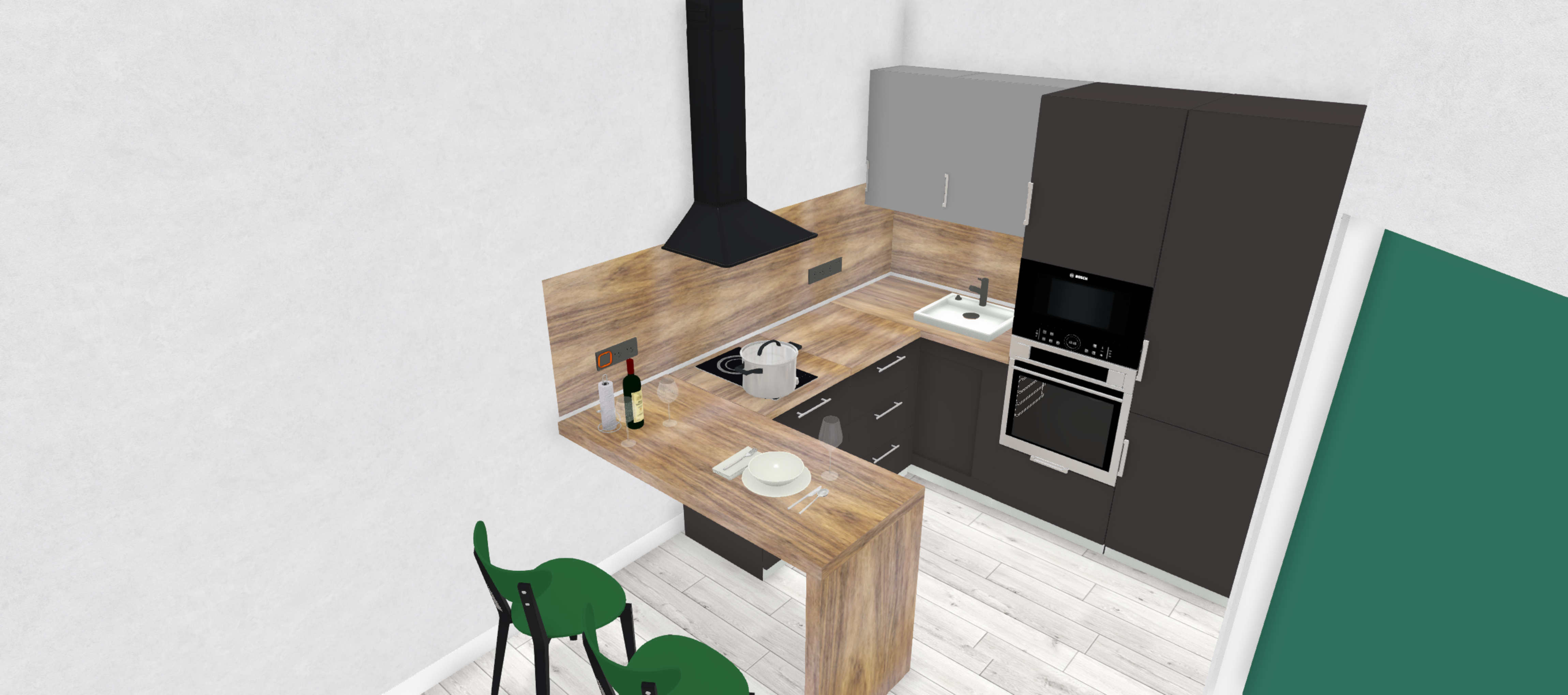 Есть будет вот такая кухонка. Подскажите, как принято делать фартук, не накрытый сверху шкафами? На одной стенке будет только вытяжка и всё. Пробовал в цвет столешницы, не нравится результат. На деле цвет столешницы менее агрессивный, не смог подобрать в редакторе.