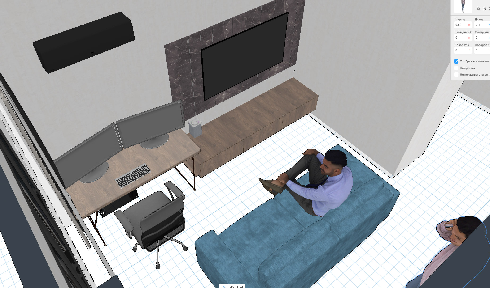 >>320425 там есть каталог манекенов, можешь людей в разных позах ставить/садить Я идущего мужика использовал, чтобы проверить, удобно будет ходить между диваном и компьютерным столом (на старом дизайне), оказалось что не очень. Поэтому все переделал