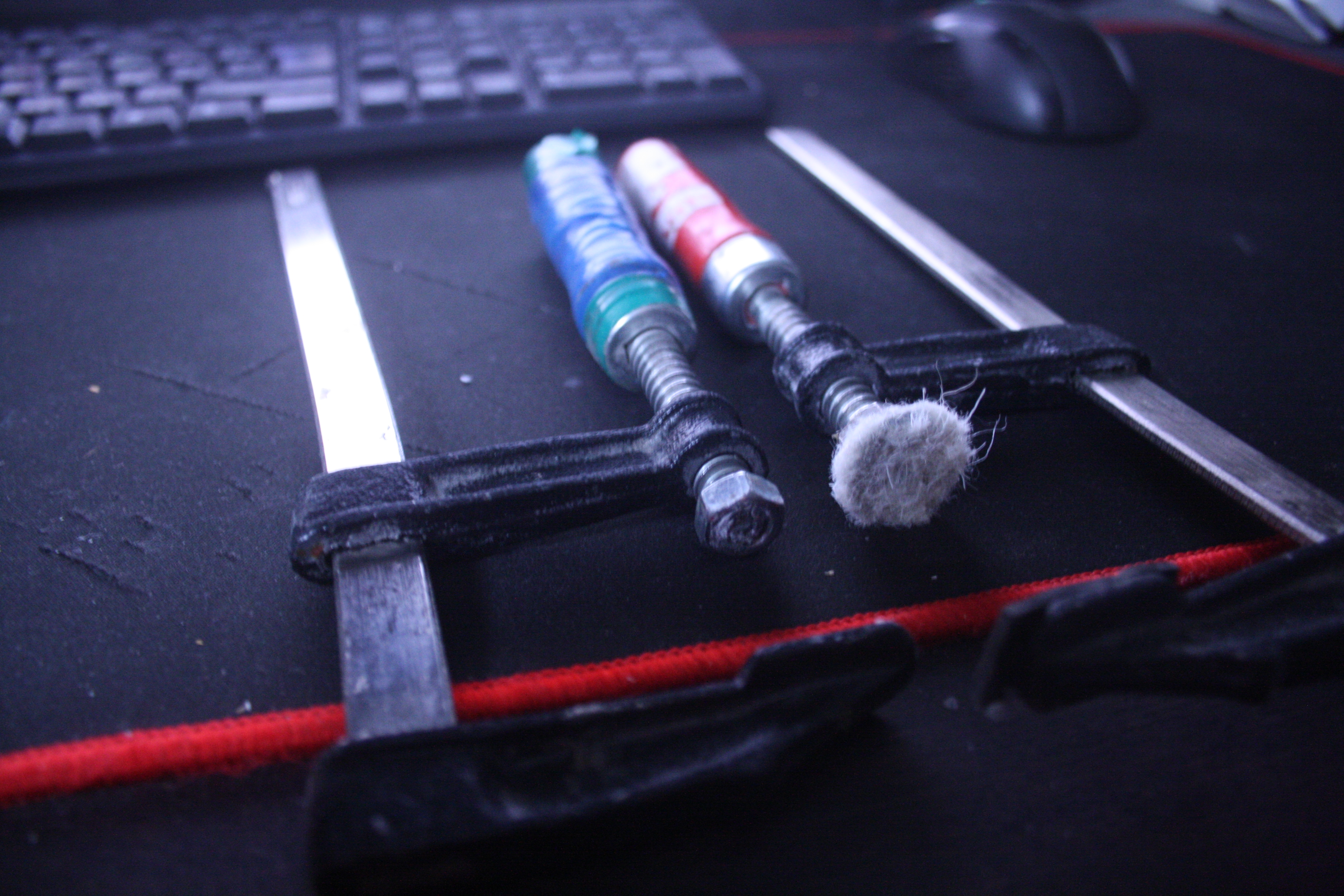 Есть вот такие две дешевые струбцины. У них на конце была вращающиеся крутилочки но они отвалились. Я закрепил там гайку чтобы создать хоть какую-то плоскость для упора, но когда эта плоскость не крутится то очень неудобно зажимать. Есть какие-то идеи как можно восстановить эту часть струбцины?