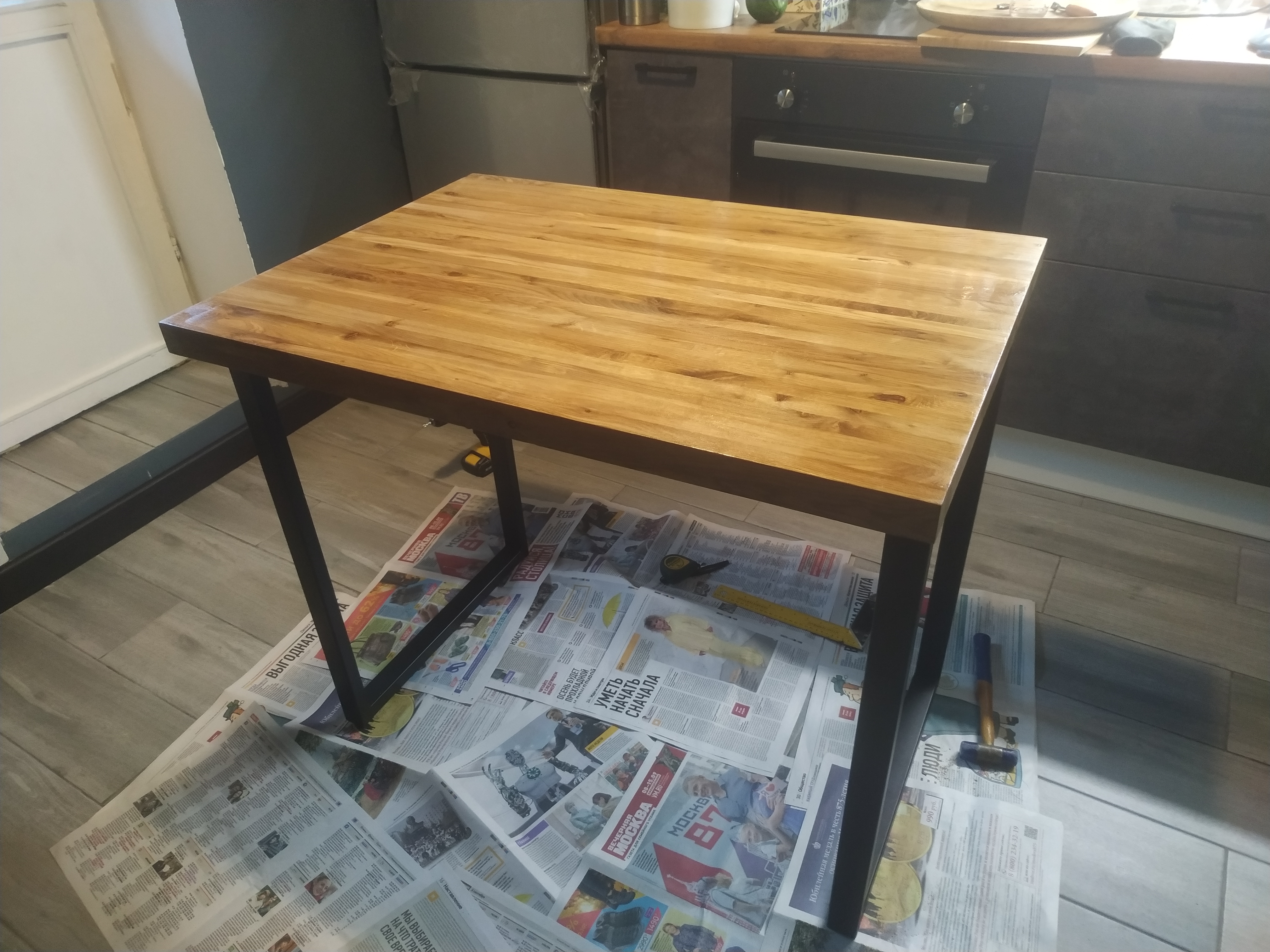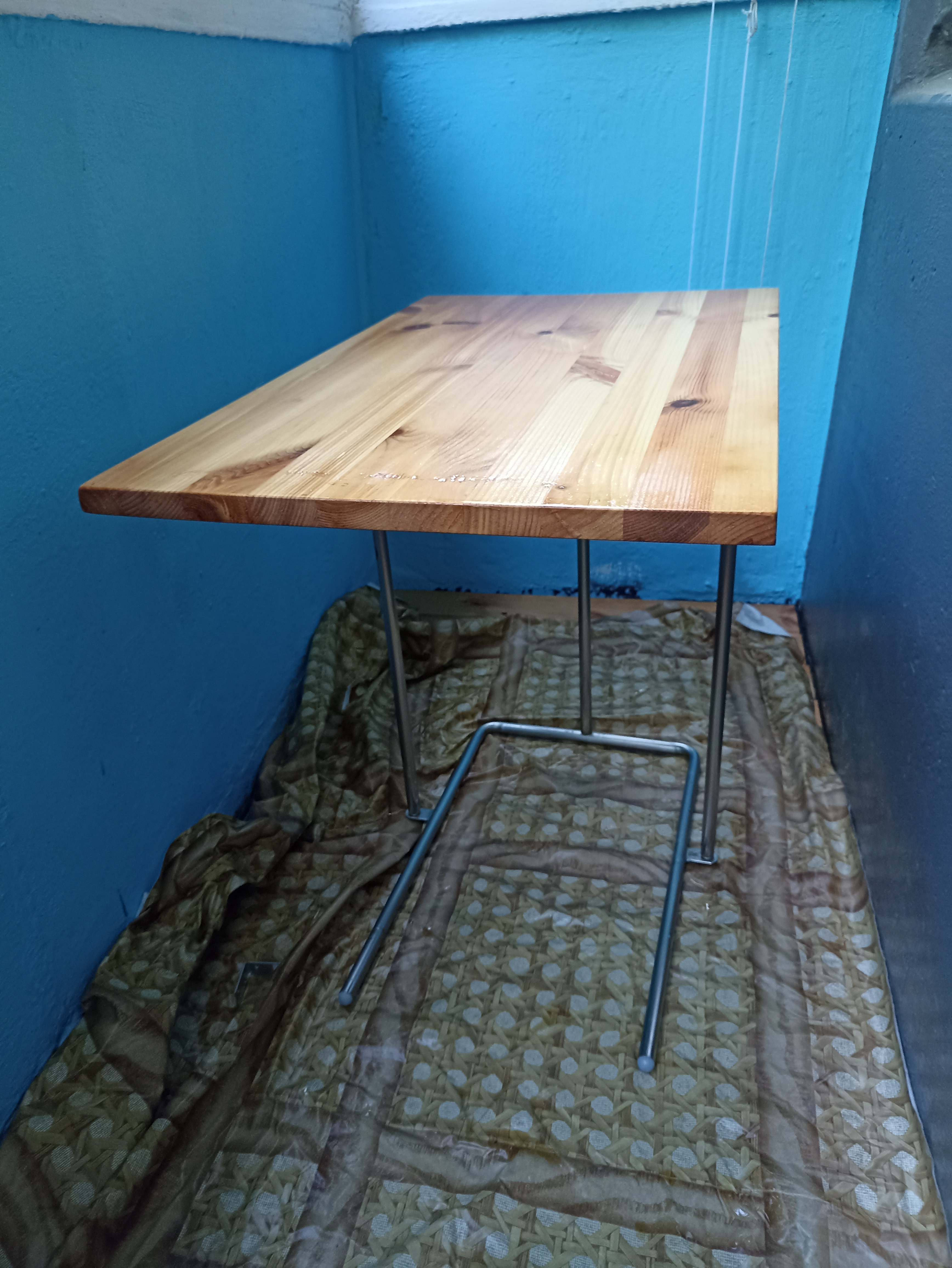Я тоже когда то хотел СТОЛ ШОБ ИЗ ДУБА 2 МЕТРА. В качестве временного решения сварил из трубы 30х30 подстолье, сверху кинул половину листа 10мм фанеры (1.5х0,75) и оказалось, что так сойдет. Ультра-бичевски вышло - 2к металл, 2к лкм (банка нитра лака, баллончик грунта, 2 баллончика акриловой эмали), фанеру в гараже нашел.