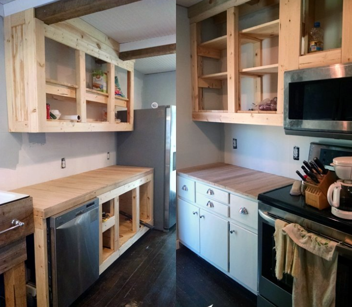 все что нужно из материала, это несколько листов фанеры 20мм для каркаса и 10мм для полок. для столешницы купи пачку дубового паркета (пример на третьем пикрелейтеде). масло для покраски можно сварить самому из подсолнечного, канифоли и скипидара (рецептов дохуя гугли). если все ящики делать выдвижными как на фотографии то там даже можно без фурнитуры обойтись - тупо на деревянных направляющих сделать, обильно смазать маслом и будет не хуже скользить. из инструментов нужна шлифмашинка. попилить фанеру можно и ножовкой уж коли циркулярки нет. еще шуроповерт и ящик саморезов. пилить фанеру можно на самой кухне на полу подстелив под нее пару листов пенопласта/пенофлекса или еще чего-нибудь.
