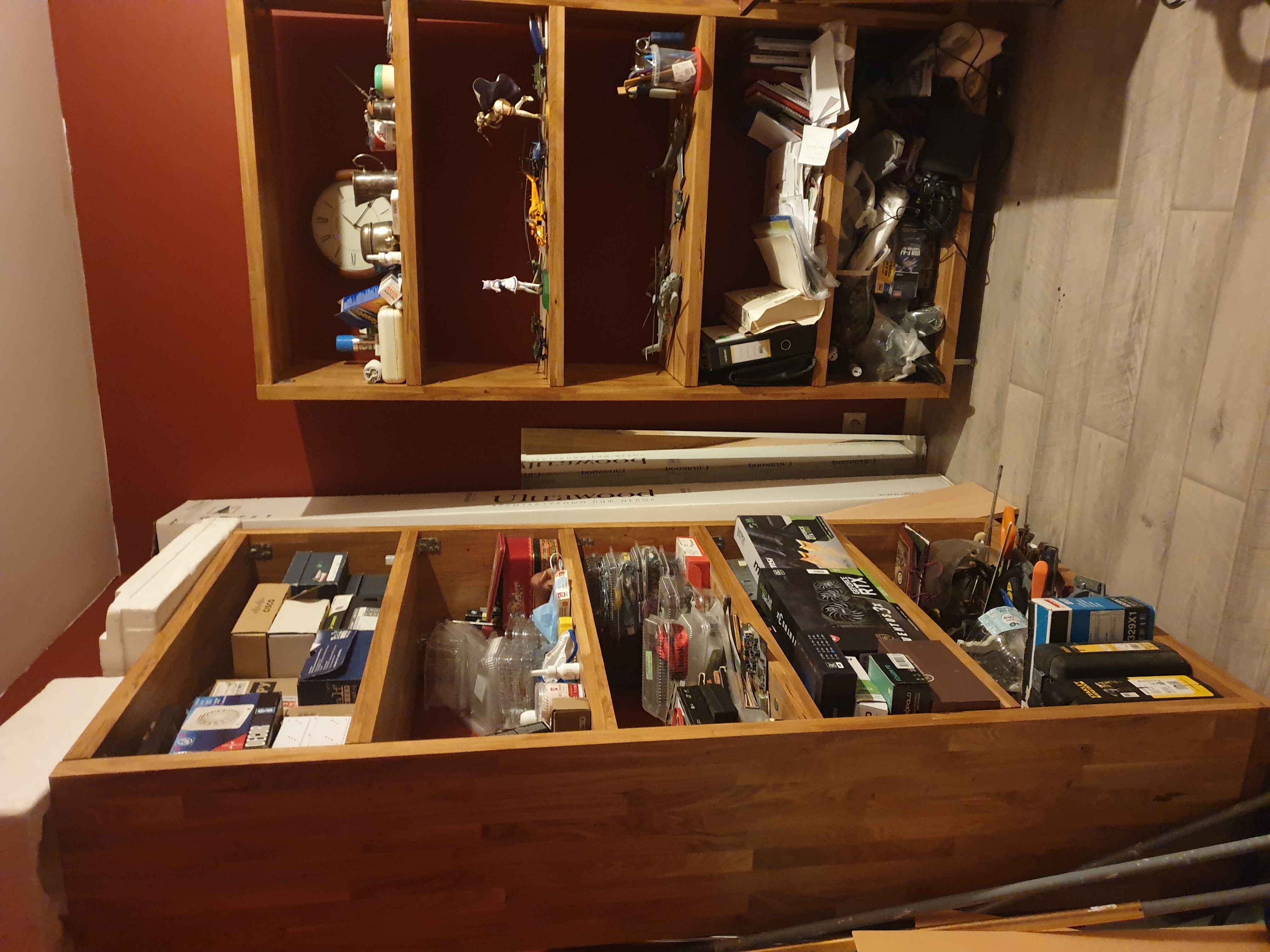 Следовательно вопрос, как это организовать? По идее, самое очевидное - это измерить каждую вещь, и под каждую из них высчитать место и размер ящика, в частности высоту и глубину, но это пиздец. Плюс ротация вещей и новых вещей - может перечеркнуть такой способ.