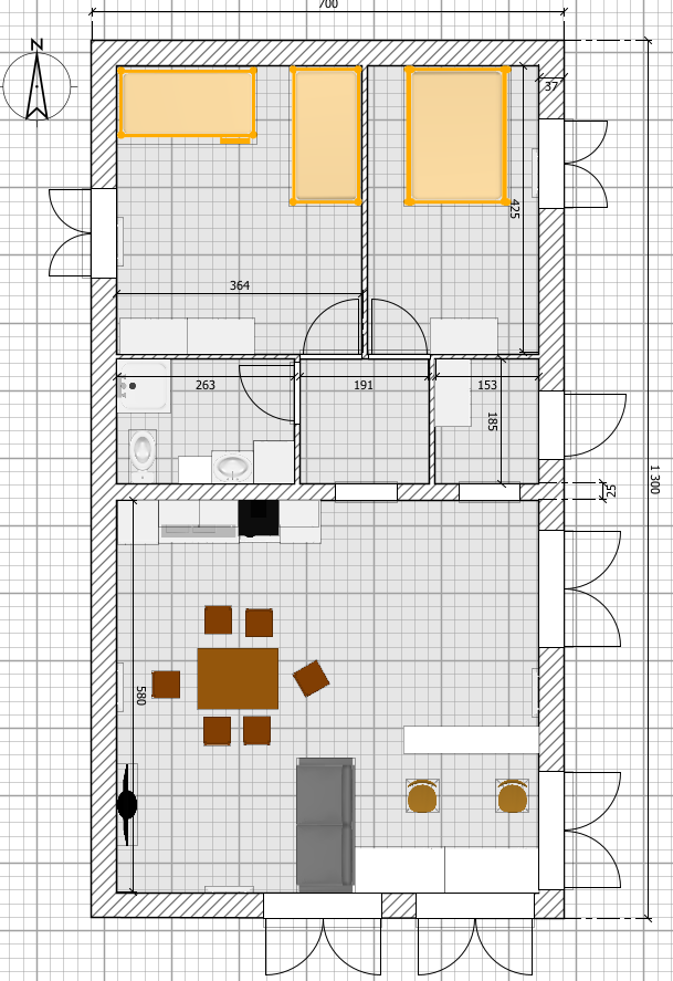 >>289004 Продолжаю, хорошо. В планах на ближайшее время — кровля (металлочерепица, 200 мм утеплителя), поставить окна и двери (окна я, кстати, вообще неплохо закупил, 61560 — это за шесть окон 134х150, одно 150х232 и дверь 90х200 с доставкой), заделать проём под гаражные ворота (по принципу каркасника — ставлю в проём короб из доски, обшиваю OSB снаружи, кладу тот же утеплитель 200 мм и закрываю внутри OSB, в итоге и тепло, и потом легко открыть), развожу коммуникации и заливаю стяжку (с утеплителем под ней). Дальше плитка на всю площадь, ставлю временные перегородки в гаражную часть (две спальни, санузел и тамбур с коридором получаются, как на плане выше), укладываю поверх плитки ламинат (он уже есть, бесплатно достались 70 квадратов). Кухня с Авито, душевая кабина из Леруа, готово. Водонагреватель тоже бесплатно достался.