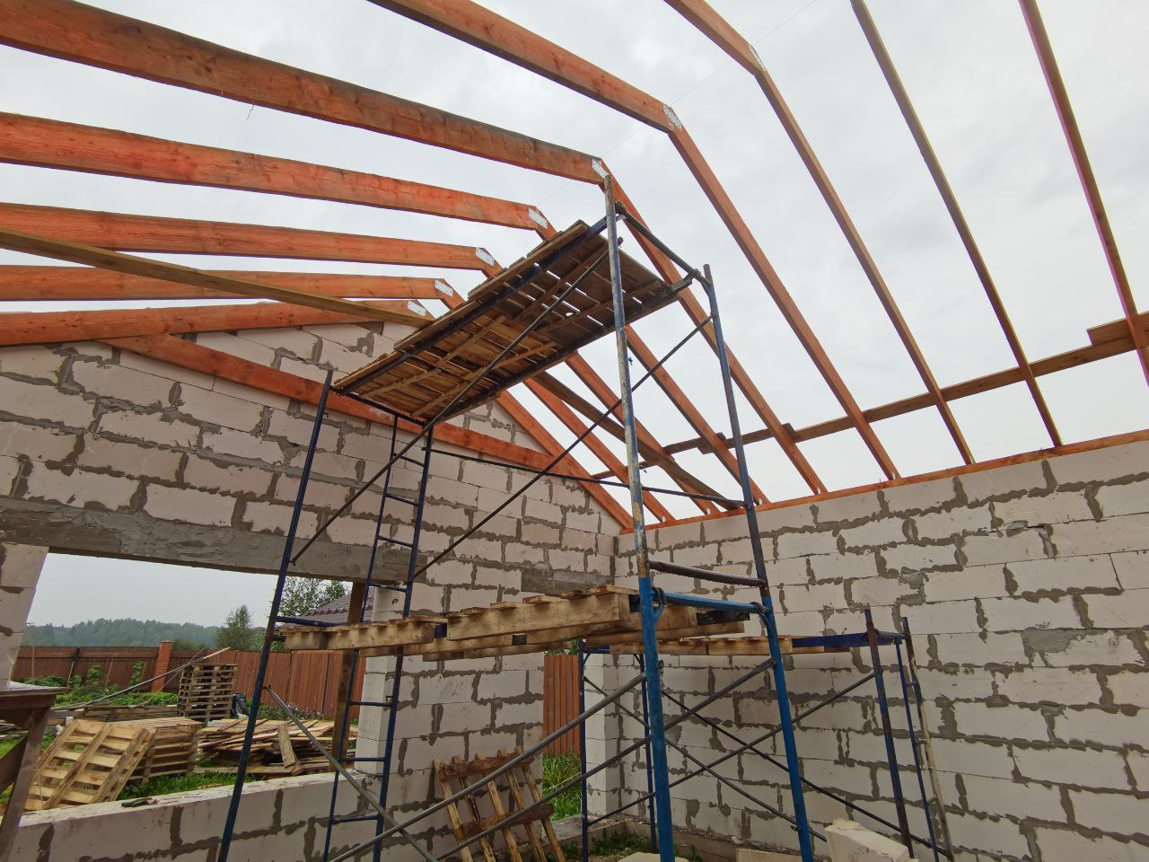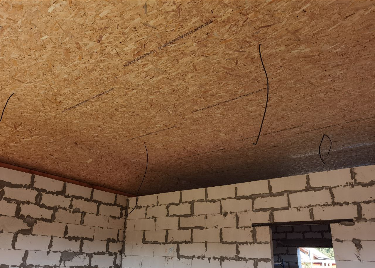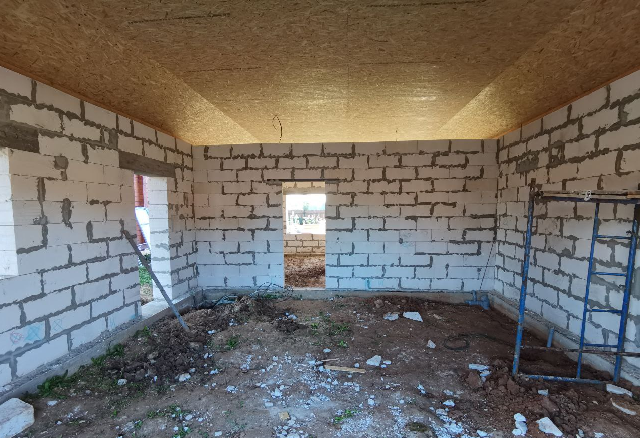 Крыша почти готова. Разбросал в одной половине строения кабелистику на розетки и свет, вывел канализацию в пределы фундамента. Ближайшие планы — закончить коммуникации и подготовиться к заливке пола.